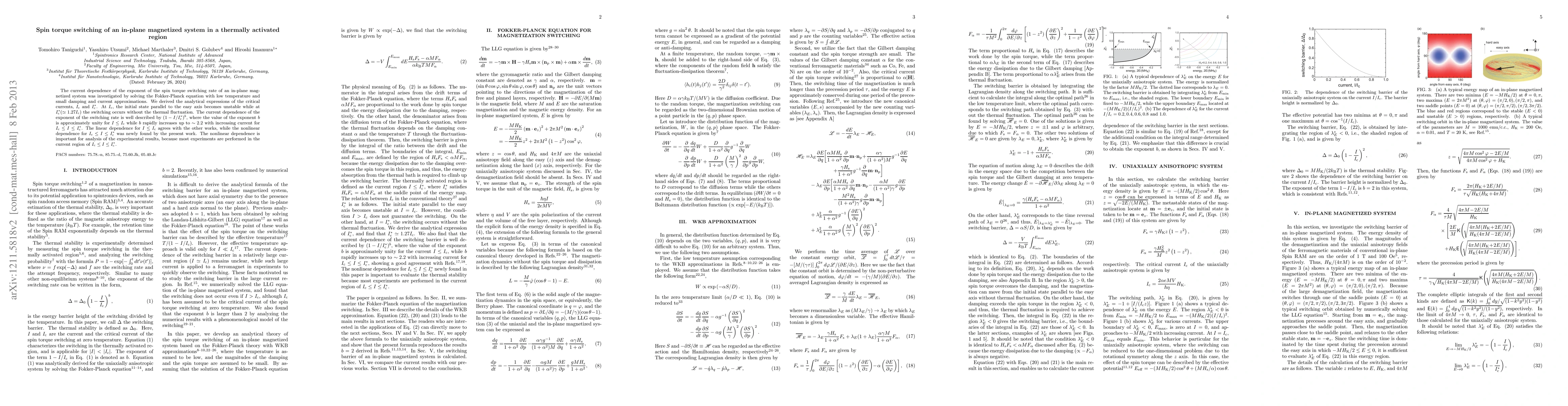 The current dependence of the exponent of the spin torque switching rate of an in-plane magnetized system was investigated by solving the Fokker-Planck equation with low temperature and small damping and current approximations. We derived the analytical expressions of the critical currents, I_{c} and I_{c}^{*}. At I_{c}, the initial state parallel to the easy axis becomes unstable, while at I_{c}^{*} (\simeq 1.27 I_{c}) the switching occurs without the thermal fluctuation. The current dependence of the exponent of the switching rate is well described by (1-I/I_{c}^{*})^{b}, where the value of the exponent b is approximately unity for I < I_{c}, while b rapidly increases up to 2.2 with increasing current for I_{c} < I < I_{c}^{*}. The linear dependence for I < I_{c} agrees with the other works, while the nonlinear dependence for I_{c} < I < I_{c}^{*} was newly found by the present work. The nonlinear dependence is important for analysis of the experimental results, because most experiments are performed in the current region of I_{c} < I < I_{c}^{*}.