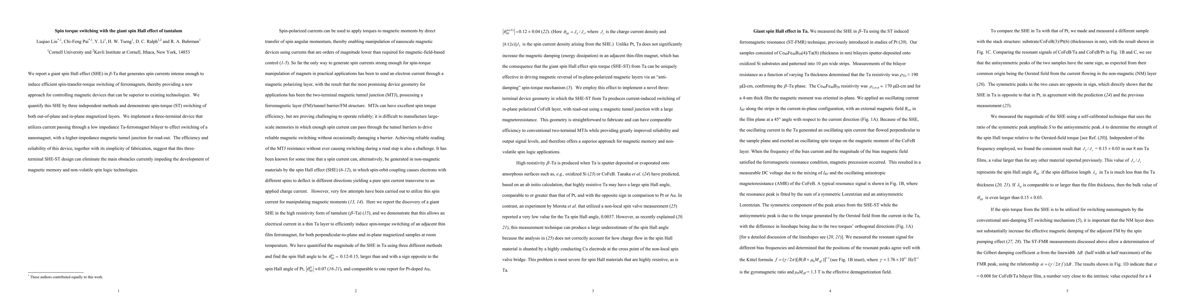 This research reports a giant spin Hall effect in tantalum that generates strong spin currents for efficient spin-torque switching of ferromagnets, offering a promising new method for controlling magnetic devices. The three-terminal device design shows high efficiency and reliability, potentially overcoming current limitations in magnetic memory and spin logic technologies.