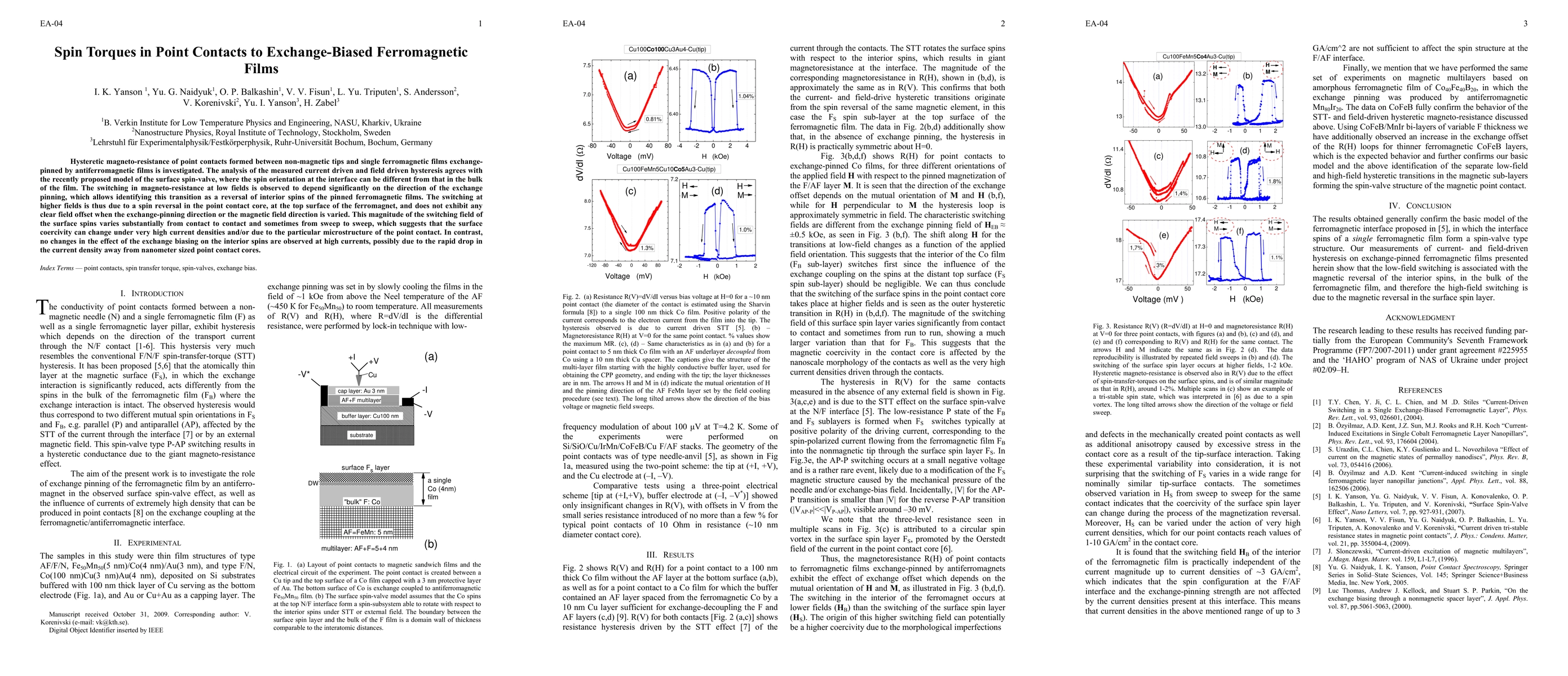 Hysteretic magneto-resistance of point contacts formed between non-magnetic tips and single ferromagnetic films exchange-pinned by antiferromagnetic films is investigated. The analysis of the measured current driven and field driven hysteresis agrees with the recently proposed model of the surface spin-valve, where the spin orientation at the interface can be different from that in the bulk of the film. The switching in magneto-resistance at low fields is observed to depend significantly on the direction of the exchange pinning, which allows identifying this transition as a reversal of interior spins of the pinned ferromagnetic films. The switching at higher fields is thus due to a spin reversal in the point contact core, at the top surface of the ferromagnet, and does not exhibit any clear field offset when the exchange-pinning direction or the magnetic field direction is varied. This magnitude of the switching field of the surface spins varies substantially from contact to contact and sometimes from sweep to sweep, which suggests that the surface coercivity can change under very high current densities and/or due to the particular microstructure of the point contact. In contrast, no changes in the effect of the exchange biasing on the interior spins are observed at high currents, possibly due to the rapid drop in the current density away from nanometer sized point contact cores.
