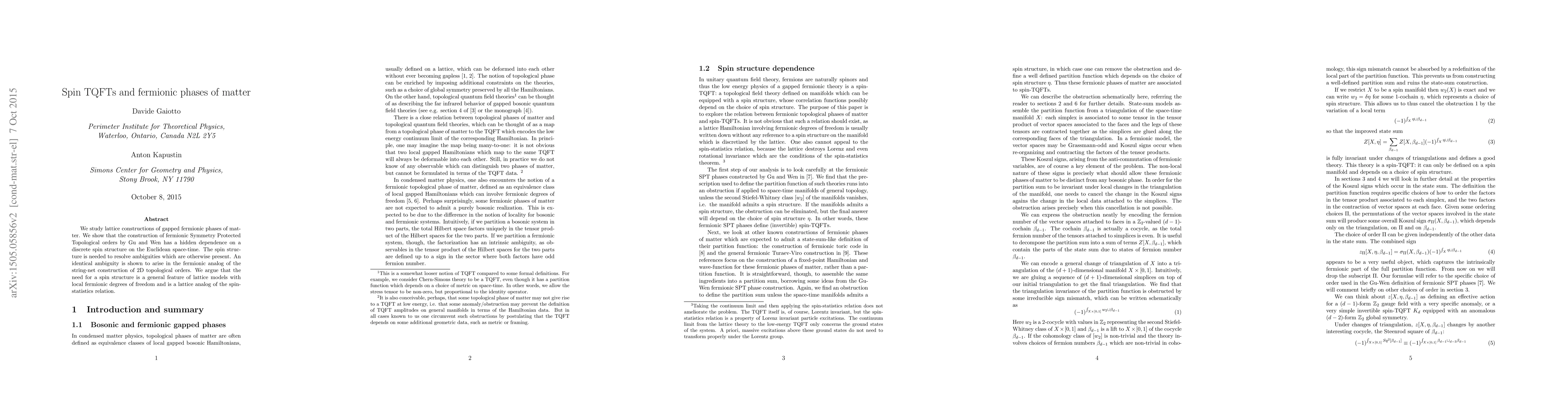 We study lattice constructions of gapped fermionic phases of matter. We show that the construction of fermionic Symmetry Protected Topological orders by Gu and Wen has a hidden dependence on a discrete spin structure on the Euclidean space-time. The spin structure is needed to resolve ambiguities which are otherwise present. An identical ambiguity is shown to arise in the fermionic analog of the string-net construction of 2D topological orders. We argue that the need for a spin structure is a general feature of lattice models with local fermionic degrees of freedom and is a lattice analog of the spin-statistics relation.