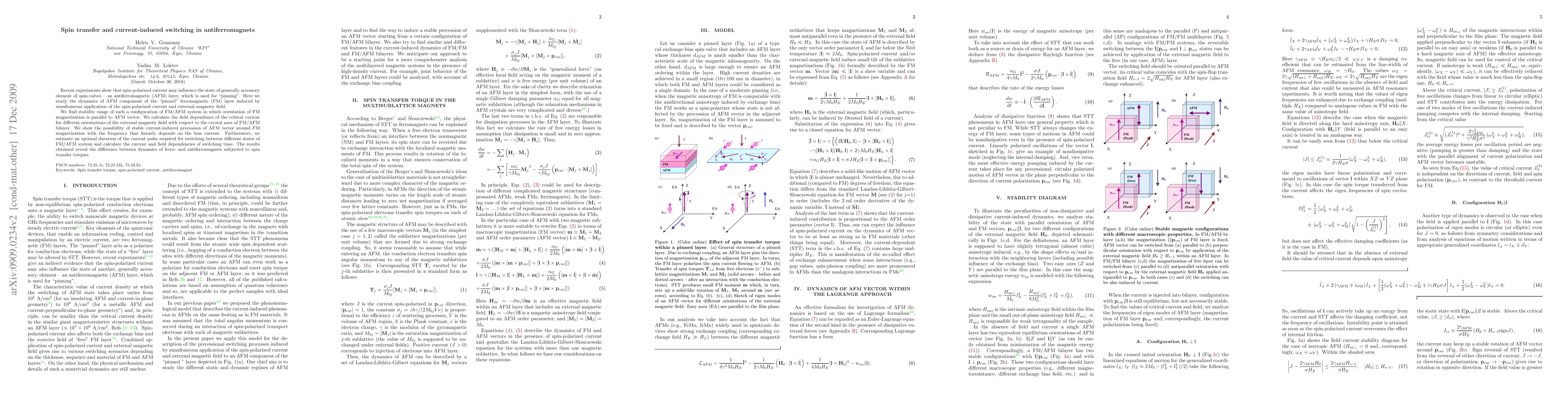 This paper theoretically explores the spin transfer and current-induced switching in antiferromagnets, identifying stability ranges for various regimes and demonstrating the dependence of precession frequency on bias current. It also determines the optimal current pulse duration for switching antiferromagnetic orientations, highlighting differences in dynamics compared to ferromagnets.