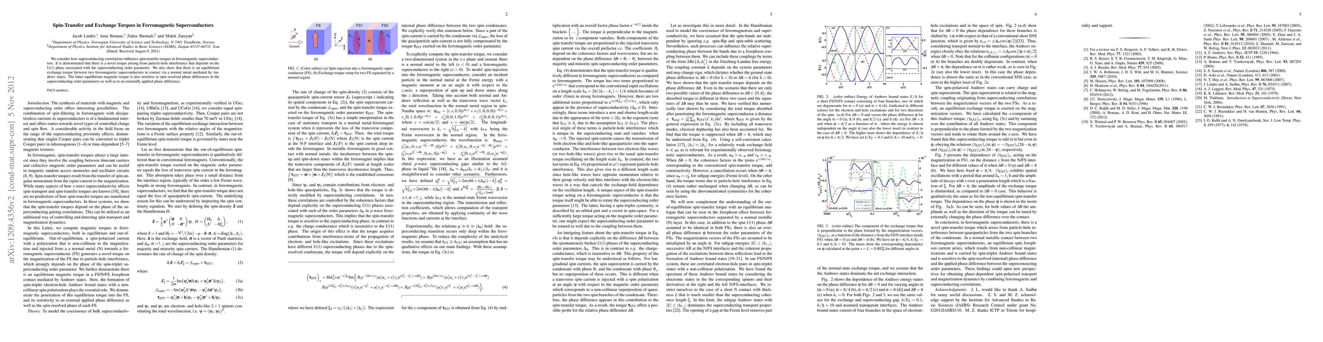 This paper explores the influence of superconducting correlations on spin-transfer torques in ferromagnetic superconductors, revealing a novel torque from particle-hole interference and an equilibrium exchange torque mediated by Andreev states, both sensitive to phase differences in the superconducting order parameters.