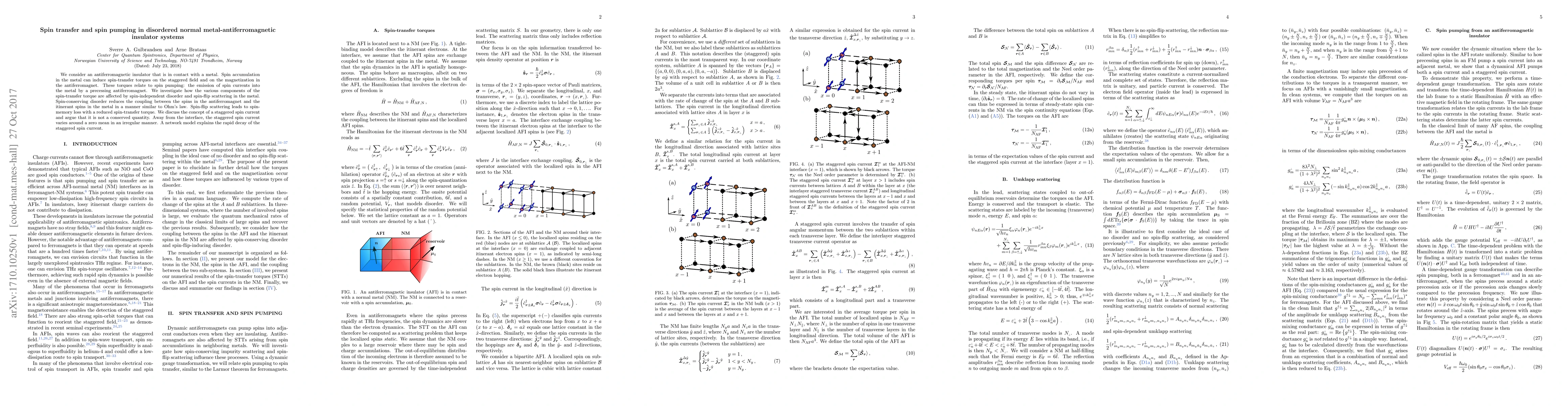 We consider an antiferromagnetic insulator that is in contact with a metal. Spin accumulation in the metal can induce spin-transfer torques on the staggered field and on the magnetization in the antiferromagnet. These torques relate to spin pumping: the emission of spin currents into the metal by a precessing antiferromagnet. We investigate how the various components of the spin-transfer torque are affected by spin-independent disorder and spin-flip scattering in the metal. Spin-conserving disorder reduces the coupling between the spins in the antiferromagnet and the itinerant spins in the metal in a manner similar to Ohm's law. Spin-flip scattering leads to spin-memory loss with a reduced spin-transfer torque. We discuss the concept of a staggered spin current and argue that it is not a conserved quantity. Away from the interface, the staggered spin current varies around a zero mean in an irregular manner. A network model explains the rapid decay of the staggered spin current.