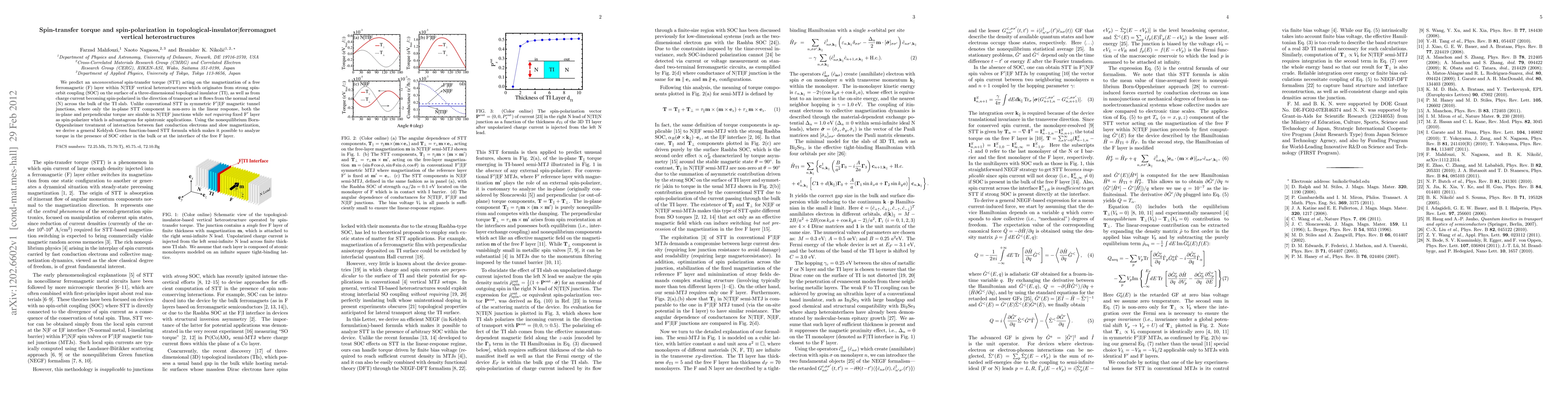 This paper predicts an unconventional spin-transfer torque (STT) in N/TI/F heterostructures due to strong spin-orbit coupling on a topological insulator's surface and spin-polarized charge current across the TI, enabling both in-plane and perpendicular torque without a fixed spin-polarizer layer. The study uses a Keldysh Green function-based formula to analyze these effects.