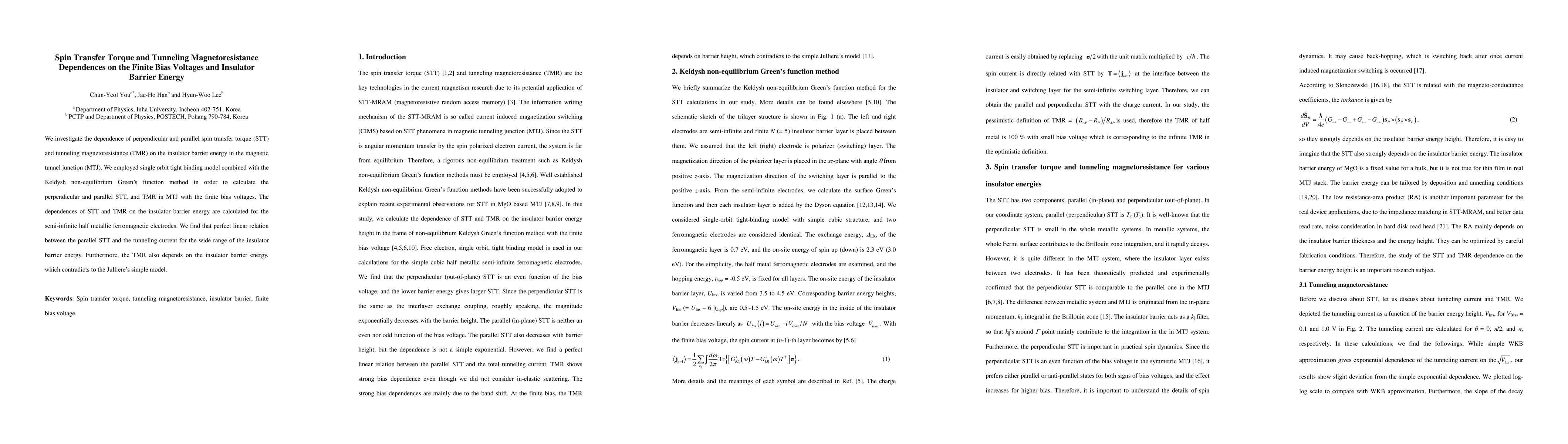 Research investigates how spin transfer torque and tunneling magnetoresistance depend on insulator barrier energy in magnetic tunnel junctions, revealing a perfect linear relation between parallel spin transfer torque and tunneling current, contradicting Julliere's simple model.