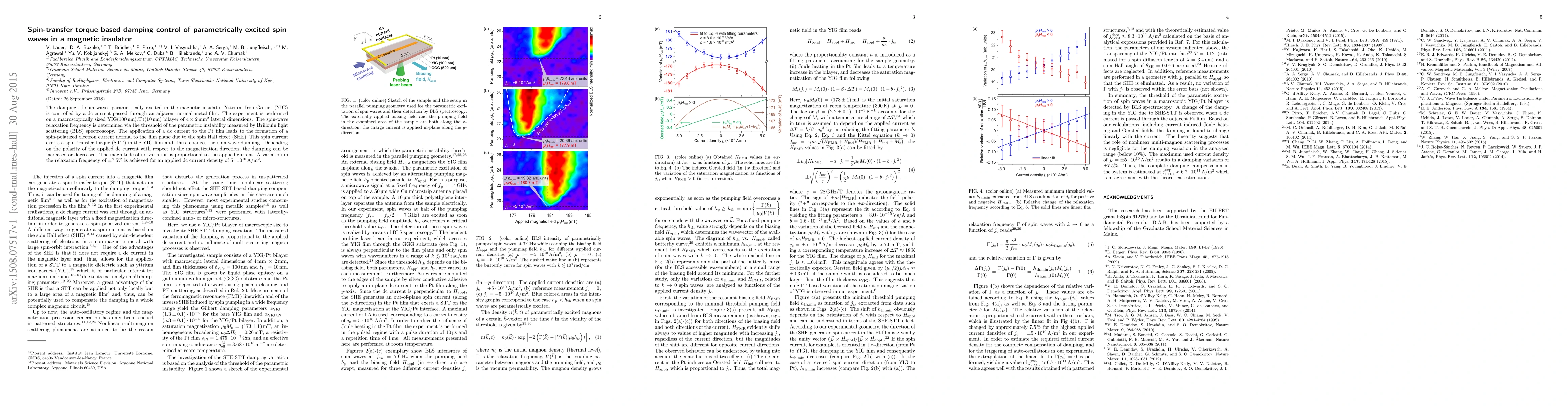 This paper investigates the control of spin-wave damping in Yttrium Iron Garnet (YIG) via spin-transfer torque induced by a dc current through an adjacent Pt film, achieving a +/-7.5% variation in relaxation frequency using Brillouin light scattering spectroscopy. The effect is mediated by the spin Hall effect generating a spin-polarized current that modifies spin-wave damping in the magnetic insulator.