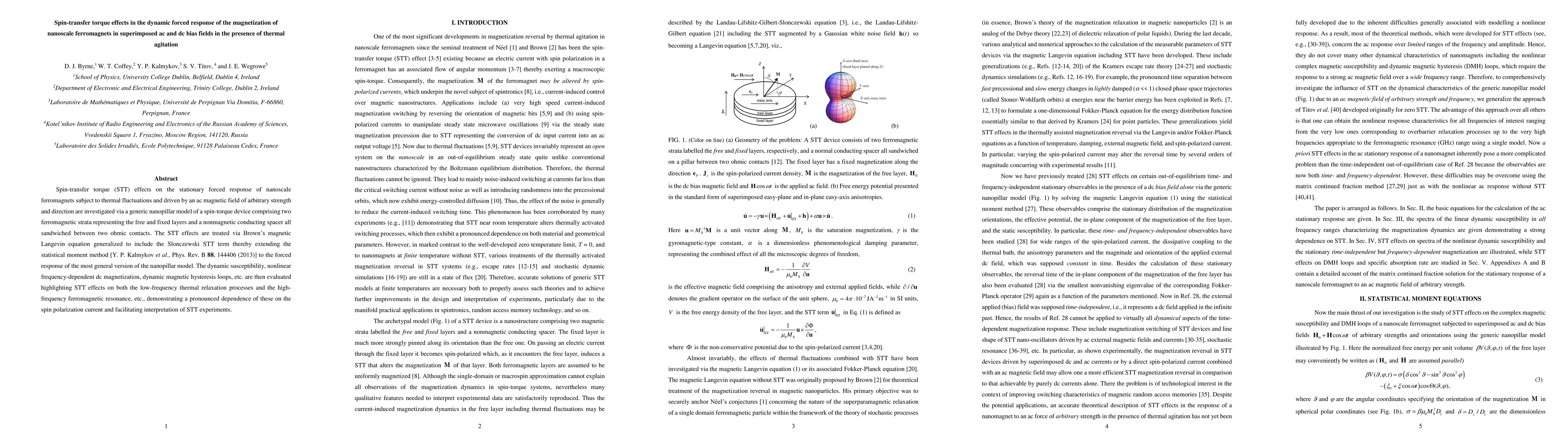 This paper investigates spin-transfer torque effects on the dynamic response of nanoscale ferromagnets under ac and dc magnetic fields, incorporating thermal fluctuations. The study employs a generalized Langevin equation to analyze the forced response, revealing significant impacts on both low-frequency relaxation and high-frequency resonance.