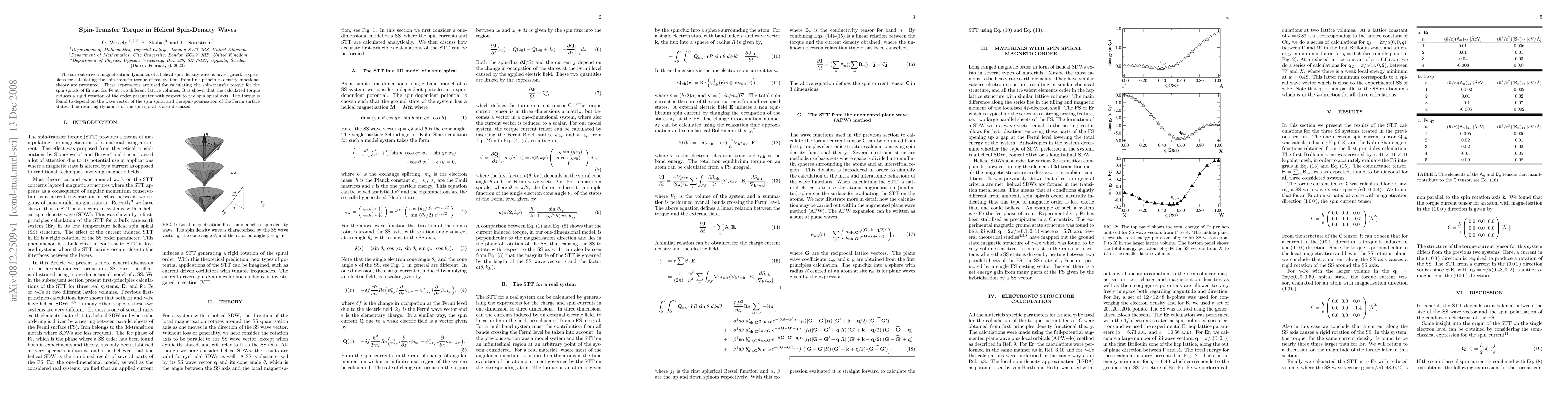 This research investigates the spin-transfer torque dynamics in helical spin-density waves, utilizing density functional theory to calculate torque in systems like Er and fcc Fe. The findings reveal a rigid rotation of the order parameter and show that torque depends on the spin spiral's wave vector and Fermi surface spin-polarization.