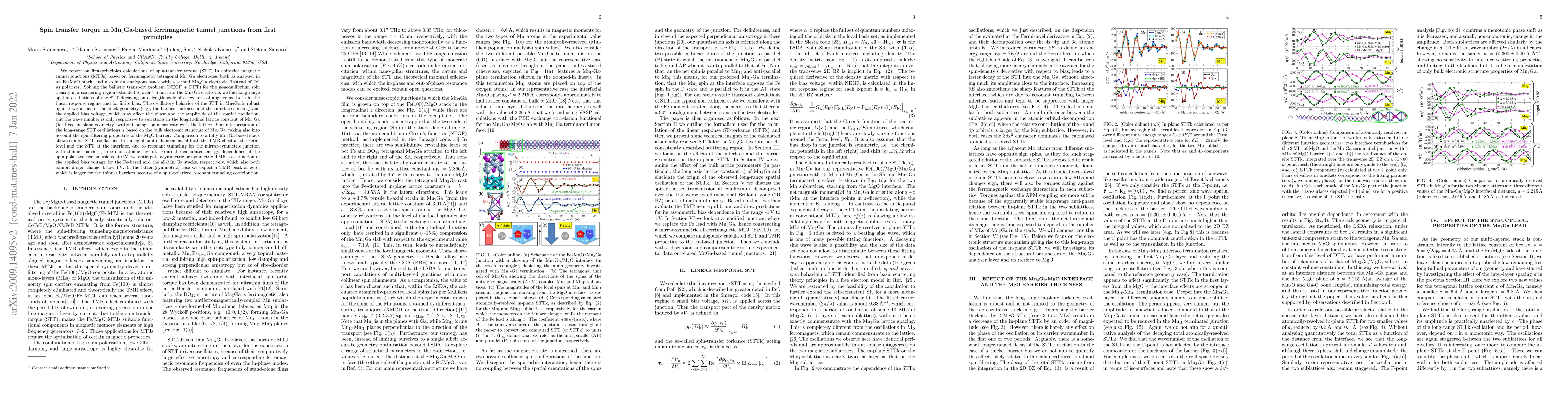 Researchers calculated spin-transfer torque in Mn$_3$Ga-based ferrimagnetic tunnel junctions using first-principles methods and found long-range spatial oscillations of the STT that decay on a few tens of angstroms, with similarities to both Fe/MgO and all-Mn$_3$Ga stacks.