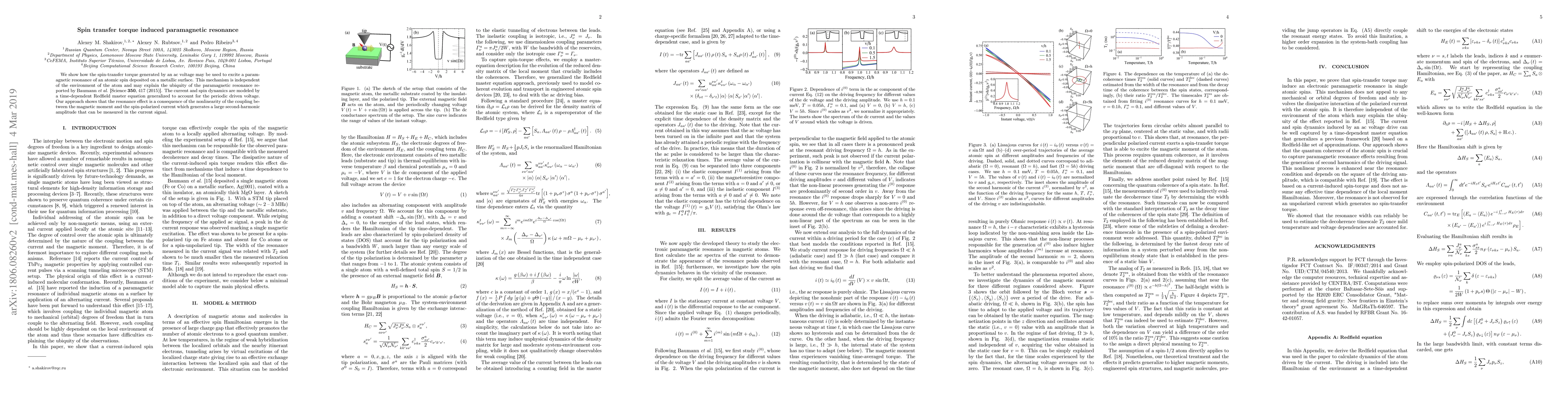 We show how the spin-transfer torque generated by an ac voltage may be used to excite a paramagnetic resonance of an atomic spin deposited on a metallic surface. This mechanism is independent of the environment of the atom and may explain the ubiquity of the paramagnetic resonance reported by Baumann $\textit{et al.}$ [$\href{http://dx.doi.org/10.1126/science.aac8703}{Science \textbf{350}, 417 (2015)}$]. The current and spin dynamics are modeled by a time-dependent Redfield master equation generalized to account for the periodic driven voltage. Our approach shows that the resonance effect is a consequence of the nonlinearity of the coupling between the magnetic moment and the spin-polarized current which generates a large second-harmonic amplitude that can be measured in the current signal.