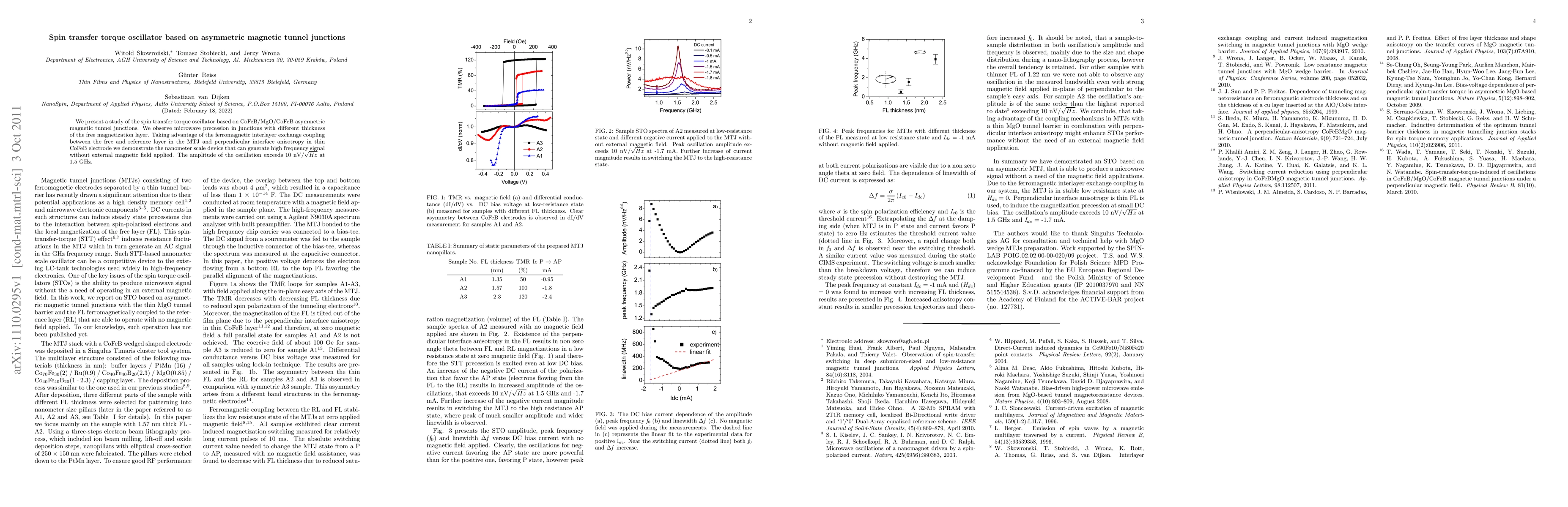 This study investigates spin transfer torque oscillators utilizing asymmetric magnetic tunnel junctions with CoFeB/MgO/CoFeB layers, showing microwave precession across varying free layer thicknesses. The device leverages ferromagnetic interlayer coupling and perpendicular anisotropy to generate high-frequency signals up to 1.5 GHz without an external magnetic field, achieving oscillation amplitudes exceeding 10 nV/Hz^0.5.