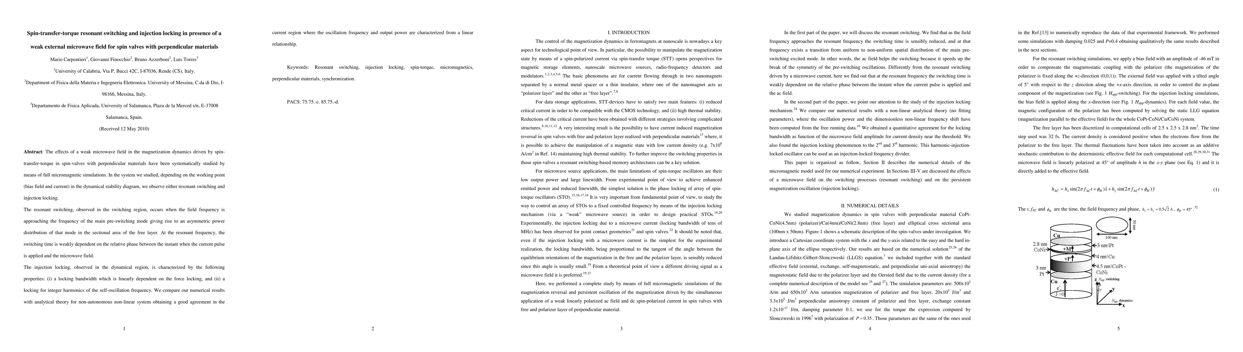 This study investigates the impact of a weak microwave field on spin-transfer-torque dynamics in spin valves with perpendicular materials, revealing resonant switching and injection locking phenomena through micromagnetic simulations. Analytical theory aligns well with the observed locking bandwidth and harmonic frequency dependencies in the dynamic region.