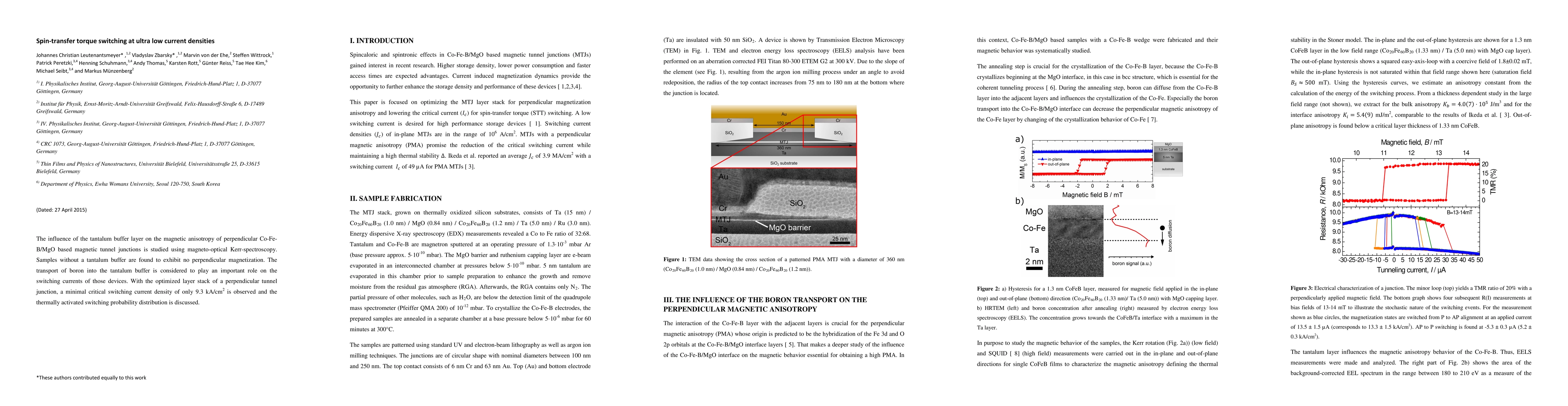 The influence of the tantalum buffer layer on the magnetic anisotropy of perpendicular Co-Fe-B/MgO based magnetic tunnel junctions is studied using magneto-optical Kerr-spectroscopy. Samples without a tantalum buffer are found to exhibit no perpendicular magnetization. The transport of Boron into the tantalum buffer is considered to play an important role on the switching currents of those devices. With the optimized layer stack of a perpendicular tunnel junction, a minimal critical switching current density of only 9.2 kA/cm$^2$ is observed. As of today, this value is the lowest reported value for current-induced magnetization reversal.