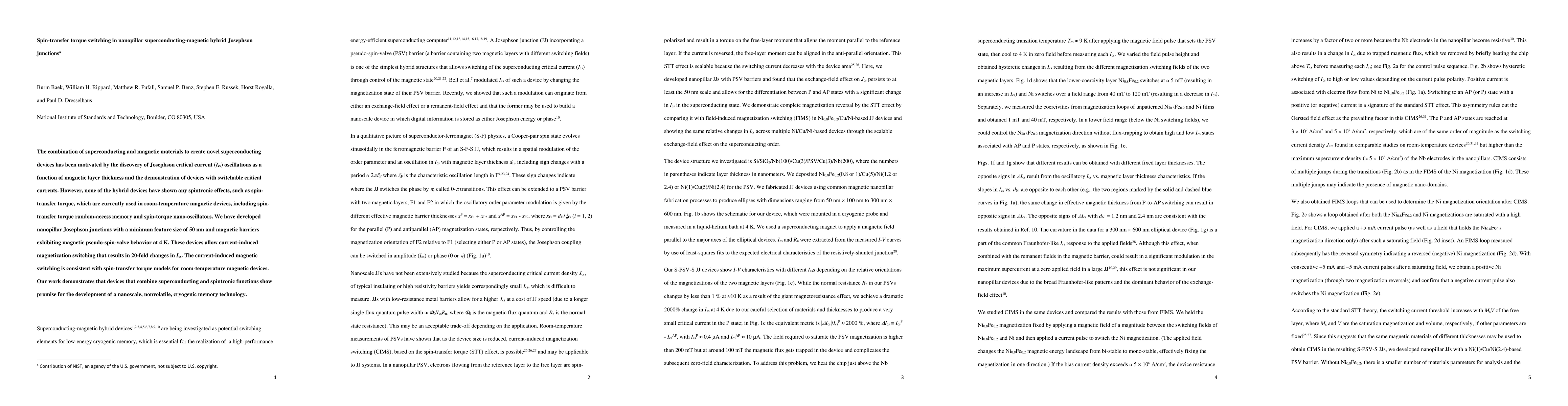 This research explores the integration of superconducting and magnetic materials in Josephson junctions to exhibit spin-transfer torque switching, achieving magnetic pseudo-spin-valve behavior and 20-fold changes in critical current, thus paving the way for nanoscale cryogenic memory technology.