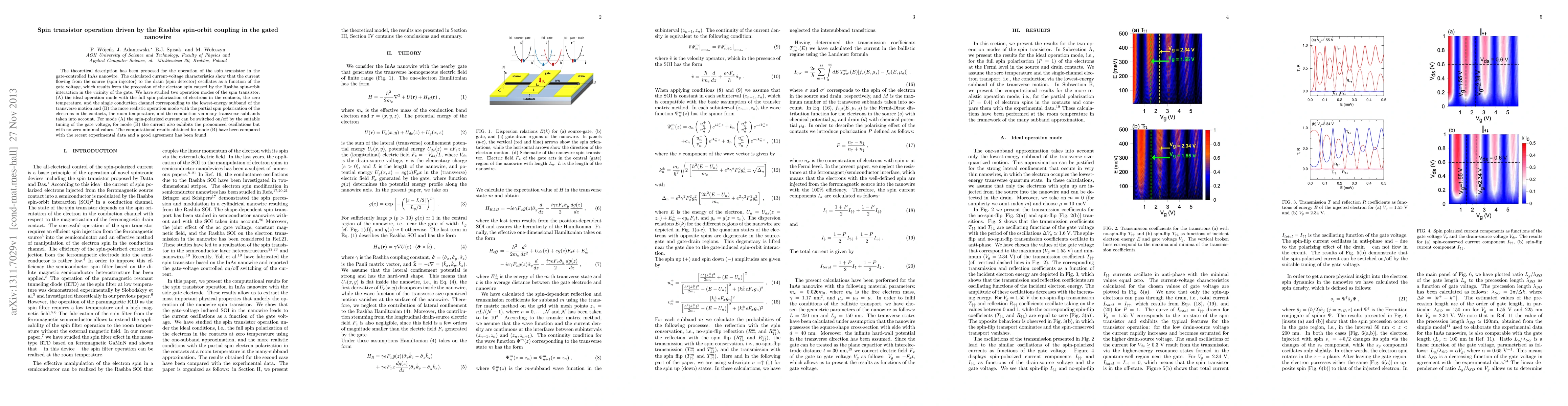 This paper proposes a theoretical model for a spin transistor operating in a gated InAs nanowire, driven by Rashba spin-orbit coupling. It demonstrates current oscillations due to spin precession influenced by the gate voltage, and compares two operation modes: an ideal one with full spin polarization and a more realistic one with partial polarization and multiple conduction channels.