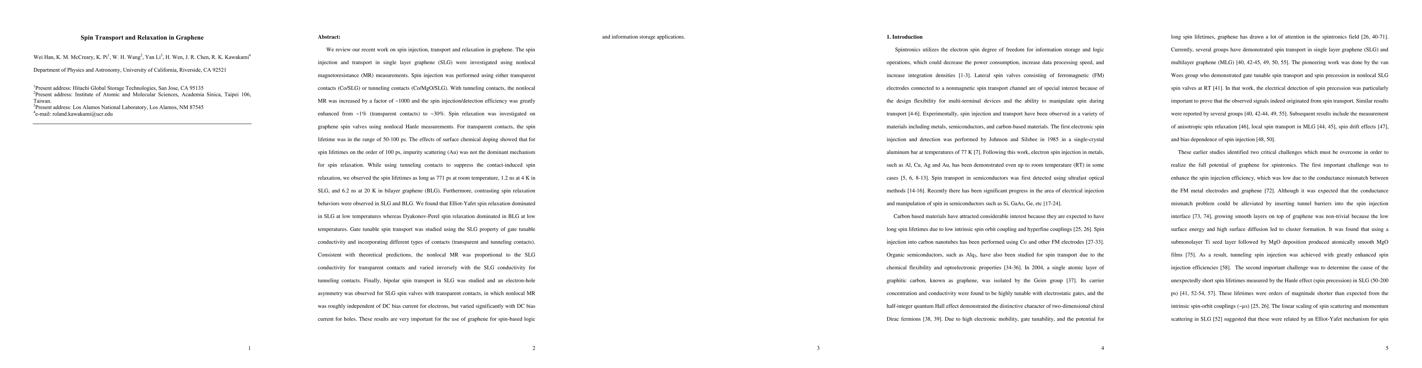 This paper reviews recent research on spin injection, transport, and relaxation in graphene, demonstrating significantly enhanced spin injection/detection efficiency using tunneling contacts. Spin lifetimes were found to be longer at lower temperatures and in bilayer graphene, with different spin relaxation mechanisms dominating in single and bilayer graphene. Gate tunable spin transport was also studied, showing inverse proportionality to conductivity for tunneling contacts.