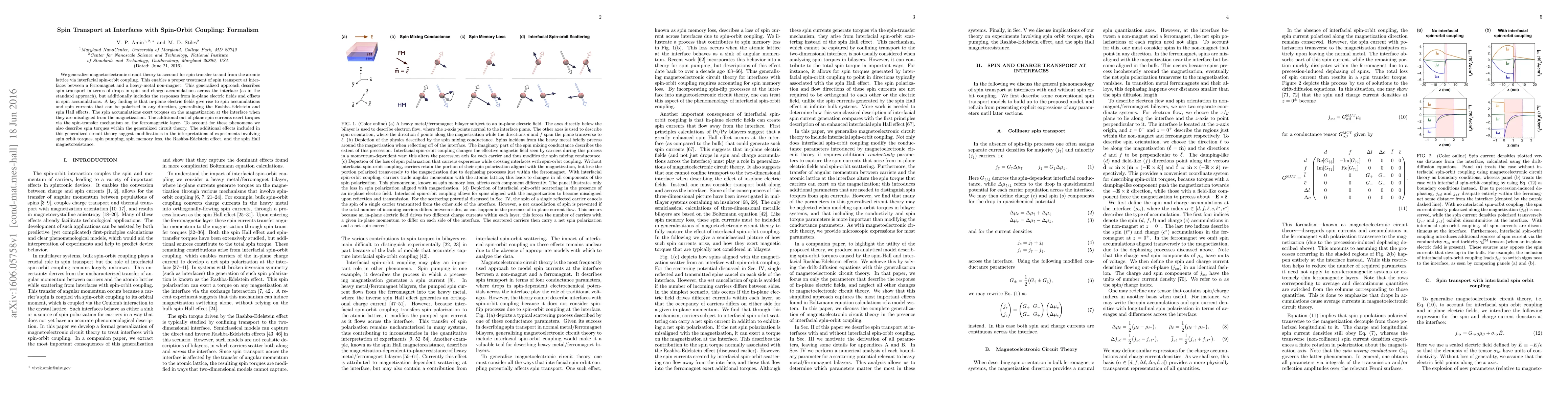 We generalize magnetoelectronic circuit theory to account for spin transfer to and from the atomic lattice via interfacial spin-orbit coupling. This enables a proper treatment of spin transport at interfaces between a ferromagnet and a heavy-metal non-magnet. This generalized approach describes spin transport in terms of drops in spin and charge accumulations across the interface (as in the standard approach), but additionally includes the responses from in-plane electric fields and offsets in spin accumulations. A key finding is that in-plane electric fields give rise to spin accumulations and spin currents that can be polarized in any direction, generalizing the Rashba-Edelstein and spin Hall effects. The spin accumulations exert torques on the magnetization at the interface when they are misaligned from the magnetization. The additional out-of-plane spin currents exert torques via the spin-transfer mechanism on the ferromagnetic layer. To account for these phenomena we also describe spin torques within the generalized circuit theory. The additional effects included in this generalized circuit theory suggest modifications in the interpretations of experiments involving spin orbit torques, spin pumping, spin memory loss, the Rashba-Edelstein effect, and the spin Hall magnetoresistance.