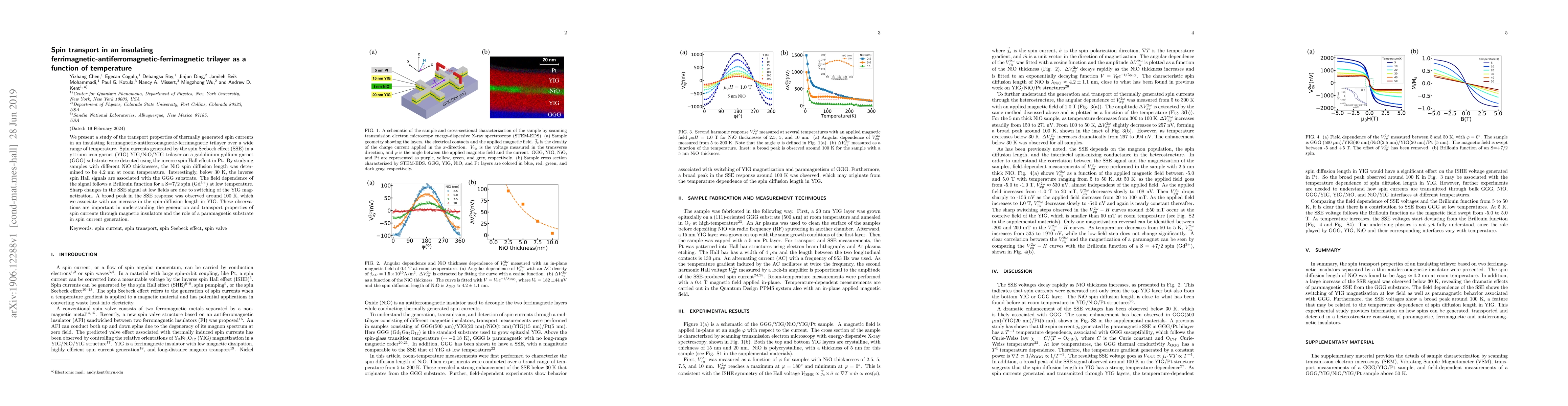 This research investigates spin current transport in an insulating ferrimagnetic-antiferromagnetic-ferrimagnetic trilayer across various temperatures. Key findings include a NiO spin diffusion length of 4.2 nm at room temperature, GGG substrate influence below 30 K, and a peak in the spin Seebeck effect (SSE) response around 100 K due to increased YIG spin-diffusion length. These results enhance understanding of spin current generation and transport in magnetic insulators, and the role of paramagnetic substrates.