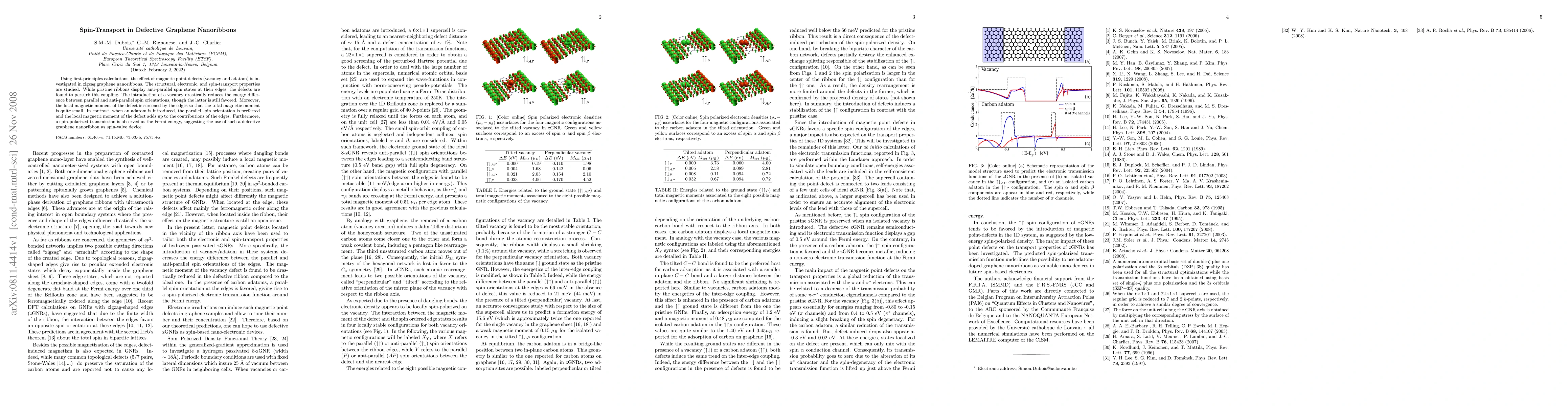 Using first-principles calculations, the effect of magnetic point defects (vacancy and adatom) is investigated in zigzag graphene nanoribbons. The structural, electronic, and spin-transport properties are studied. While pristine ribbons display anti-parallel spin states at their edges, the defects are found to perturb this coupling. The introduction of a vacancy drastically reduces the energy difference between parallel and anti-parallel spin orientations, though the latter is still favored. Moreover, the local magnetic moment of the defect is screened by the edges so that the total magnetic moment is quite small. In contrast, when an adatom is introduced, the parallel spin orientation is preferred and the local magnetic moment of the defect adds up to the contributions of the edges. Furthermore, a spin-polarized transmission is observed at the Fermi energy, suggesting the use of such a defective graphene nanoribbon as spin-valve device.