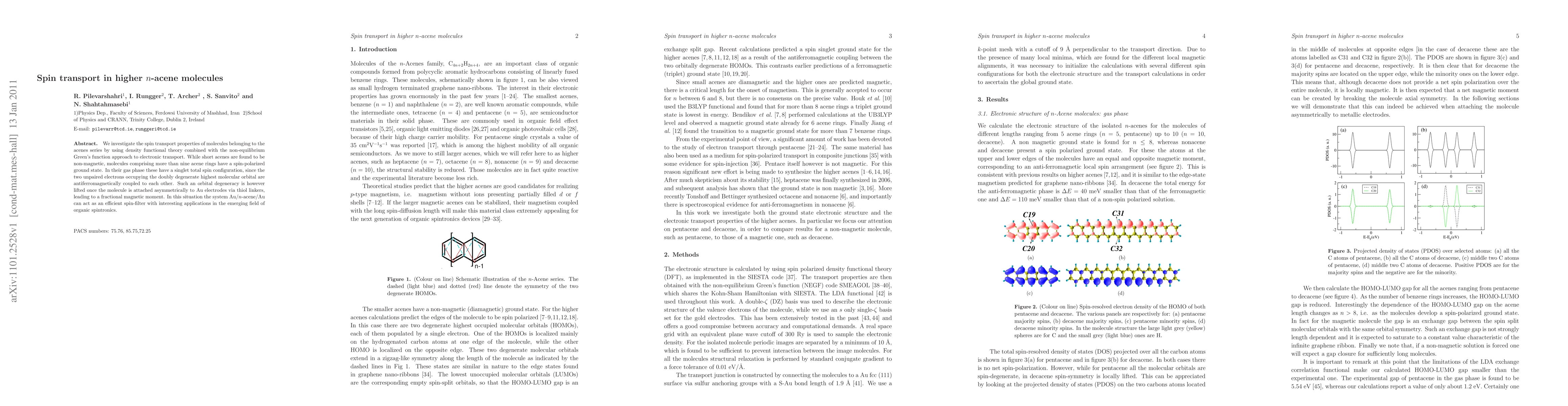 We investigate the spin transport properties of molecules belonging to the acenes series by using density functional theory combined with the non-equilibrium Green's function approach to electronic transport. While short acenes are found to be non-magnetic, molecules comprising more than nine acene rings have a spin-polarized ground state. In their gas phase these have a singlet total spin configuration, since the two unpaired electrons occupying the doubly degenerate highest molecular orbital are antiferromagnetically coupled to each other. Such an orbital degeneracy is however lifted once the molecule is attached asymmetrically to Au electrodes via thiol linkers, leading to a fractional magnetic moment. In this situation the system Au/n-acene/Au can act as an efficient spin-filter with interesting applications in the emerging field of organic spintronics.