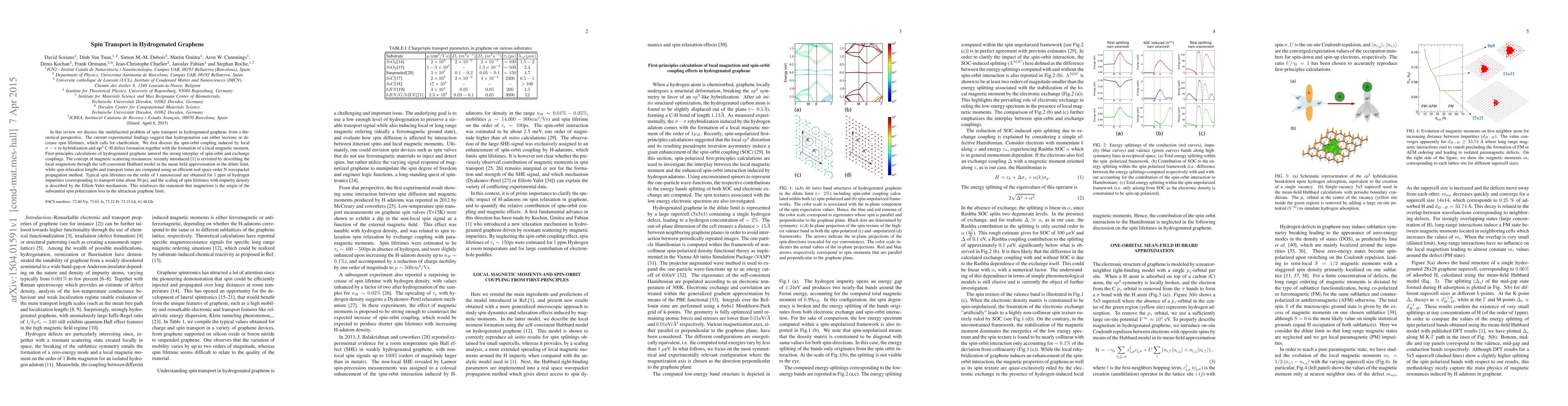 This paper reviews theoretical perspectives on spin transport in hydrogenated graphene, highlighting the effects of hydrogenation on spin lifetimes and the interplay of spin-orbit and exchange couplings. It employs first-principles calculations and a self-consistent Hubbard model to explore local magnetic moments and magnetic scattering resonances, concluding that magnetism leads to significant spin polarization loss in graphene.