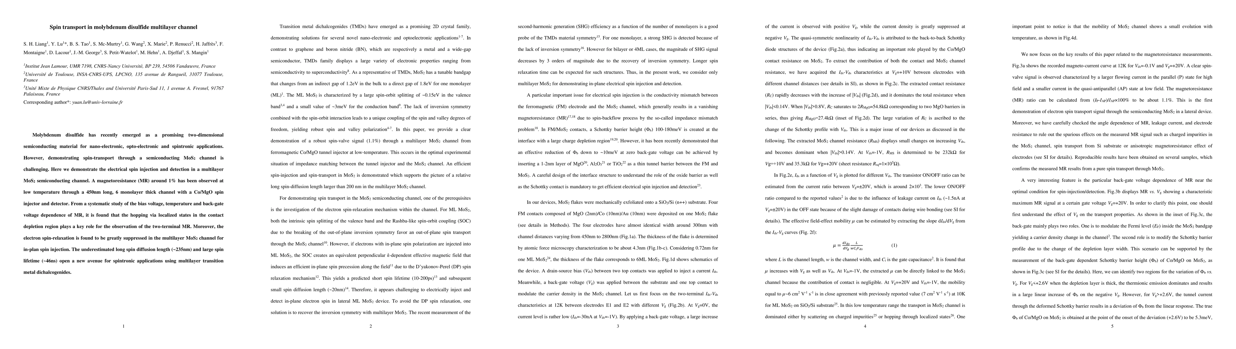This study demonstrates electrical spin injection and detection in a multilayer MoS2 channel, showing a magnetoresistance of 1% and highlighting suppressed electron spin-relaxation. The findings suggest a long spin diffusion length and large spin lifetime, promising for spintronic applications.