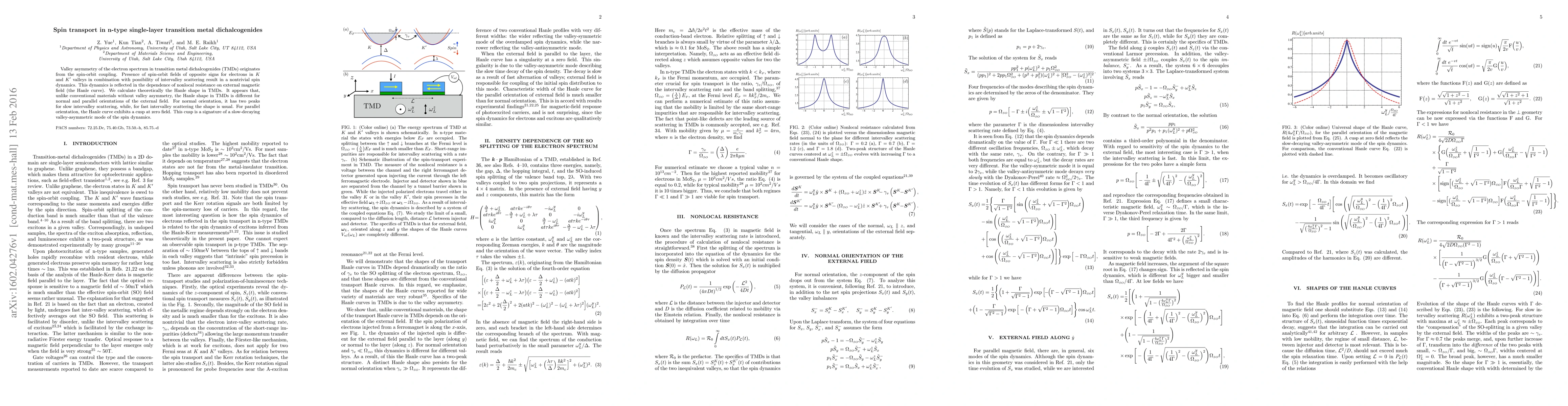 Valley asymmetry of the electron spectrum in transition metal dichalcogenides (TMDs) originates from the spin-orbit coupling. Presence of spin-orbit fields of opposite signs for electrons in K and K' valleys in combination with possibility of intervalley scattering result in a nontrivial spin dynamics. This dynamics is reflected in the dependence of nonlocal resistance on external magnetic field (the Hanle curve). We calculate theoretically the Hanle shape in TMDs. It appears that, unlike conventional materials without valley asymmetry, the Hanle shape in TMDs is different for normal and parallel orientations of the external field. For normal orientation, it has two peaks for slow intervalley scattering, while, for fast intervalley scattering the shape is usual. For parallel orientation, the Hanle curve exhibits a cusp at zero field. This cusp is a signature of a slow-decaying valley-asymmetric mode of the spin dynamics.