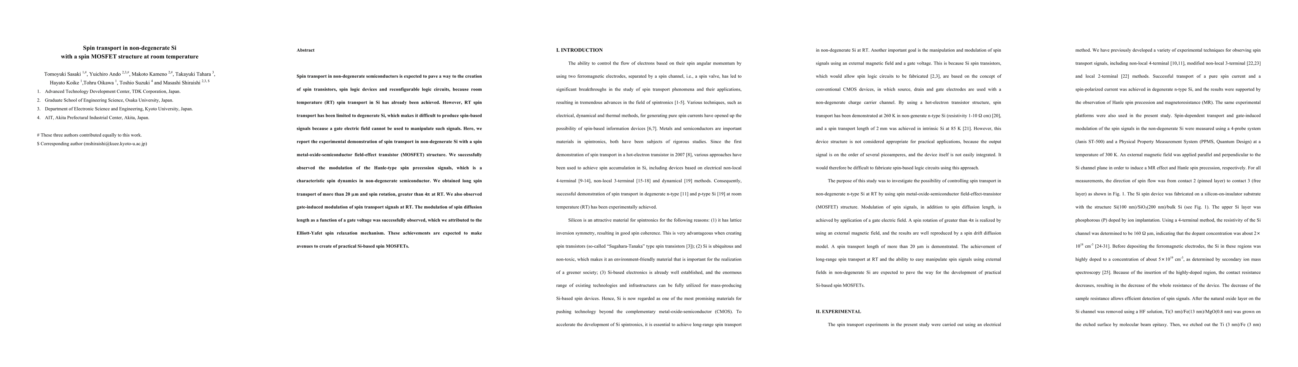 This paper demonstrates spin transport in non-degenerate silicon using a spin MOSFET structure at room temperature, achieving long spin transport and gate-induced modulation of spin signals, paving the way for practical Si-based spin transistors and logic devices.