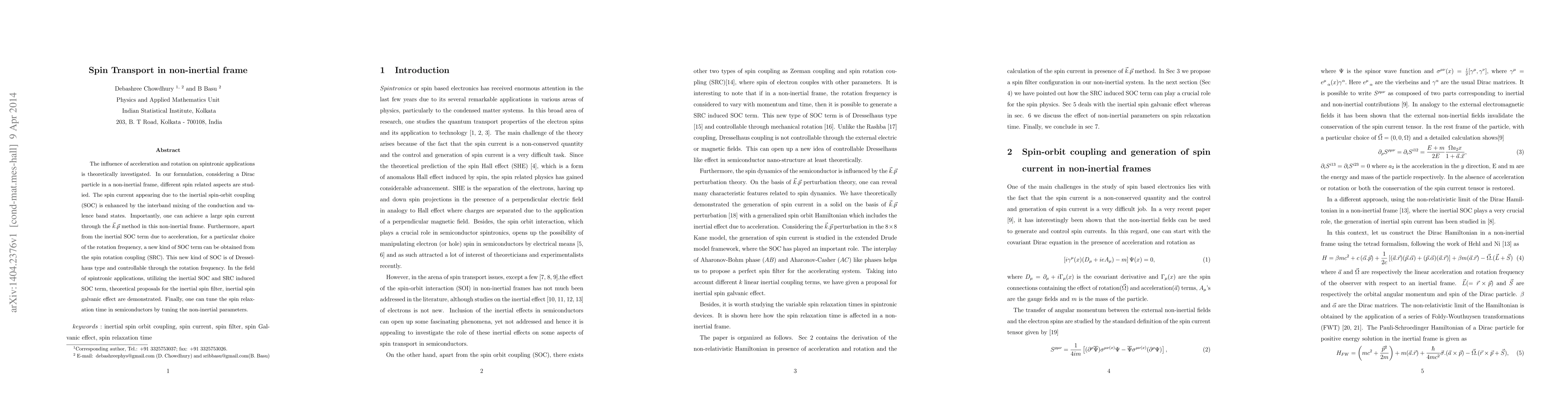 This paper investigates the effects of acceleration and rotation on spin transport in non-inertial frames, demonstrating enhanced spin current via interband mixing and introducing a controllable Dresselhaus-type spin-orbit coupling from spin rotation. Theoretical proposals for inertial spintronic effects, including the inertial spin filter and galvanic effect, are presented.