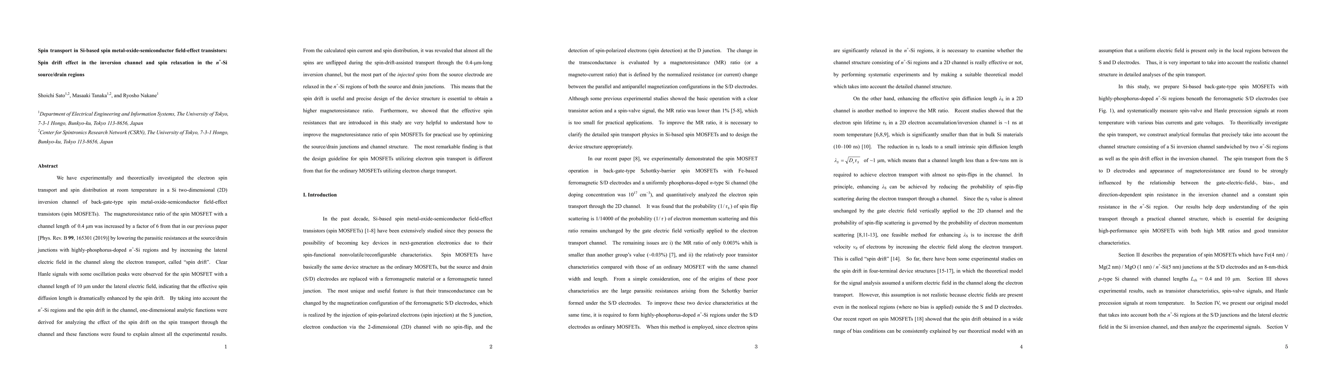 This paper investigates spin transport in Si-based spin MOSFETs, demonstrating that "spin drift" enhances the spin diffusion length and improves magnetoresistance by optimizing source/drain regions. Despite effective spin drift, spin relaxation in n+-Si regions limits overall spin preservation, highlighting the need for precise device structure design.