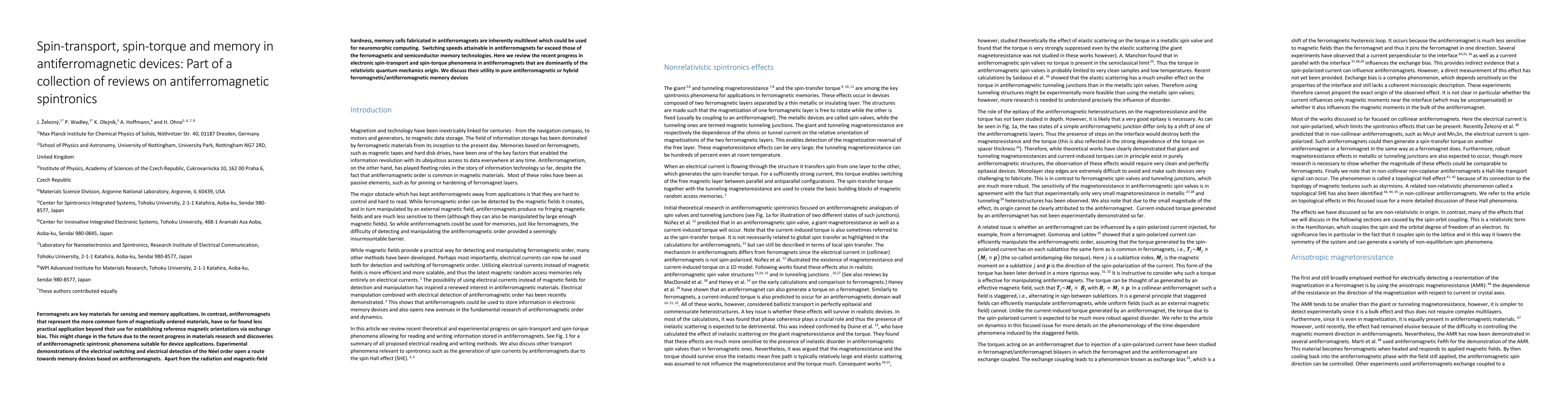 Ferromagnets are key materials for sensing and memory applications. In contrast, antiferromagnets that represent the more common form of magnetically ordered materials, have so far found less practical application beyond their use for establishing reference magnetic orientations via exchange bias. This might change in the future due to the recent progress in materials research and discoveries of antiferromagnetic spintronic phenomena suitable for device applications. Experimental demonstrations of the electrical switching and electrical detection of the N\'eel order open a route towards memory devices based on antiferromagnets. Apart from the radiation and magnetic-field hardness, memory cells fabricated in antiferromagnets are inherently multilevel which could be used for neuromorphic computing. Switching speeds attainable in antiferromagnets far exceed those of the ferromagnetic and semiconductor memory technologies. Here we review the recent progress in electronic spin-transport and spin-torque phenomena in antiferromagnets that are dominantly of the relativistic quantum mechanics origin. We discuss their utility in pure antiferromagnetic or hybrid ferromagnetic/antiferromagnetic memory devices