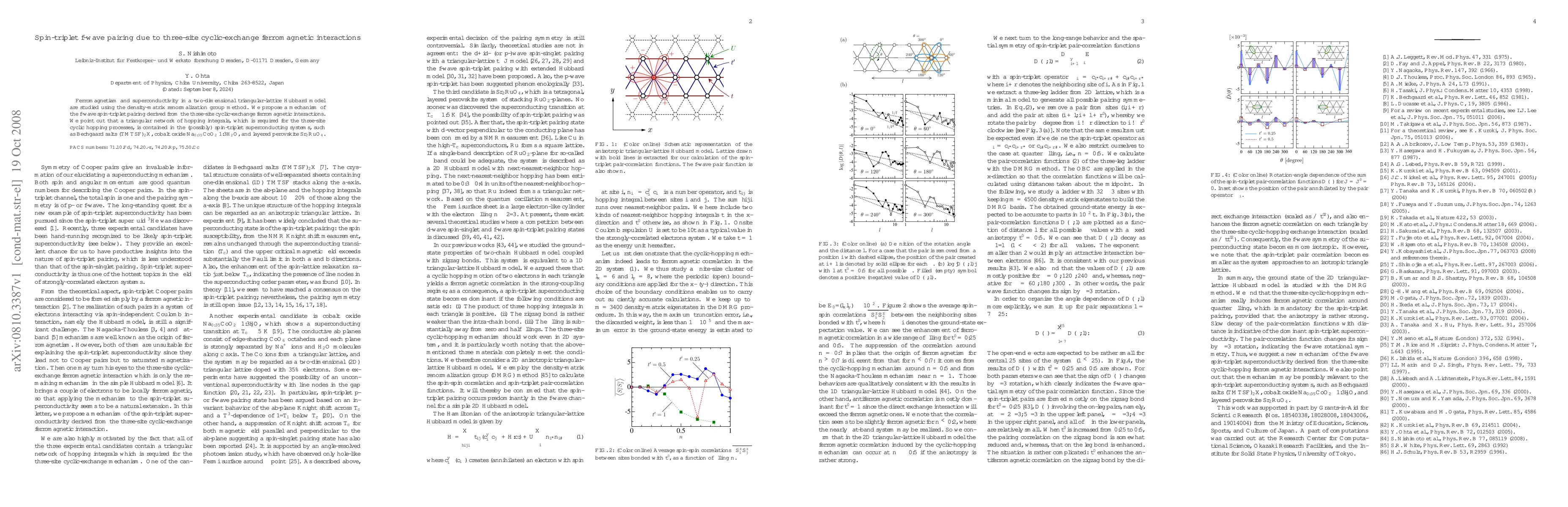 Ferromagnetiam and superconductivity in a two-dimensional triangular-lattice Hubbard model are studied using the density-matrix renormalization group method. We propose a mechanism of the {\it f}-wave spin-triplet pairing derived from the three-site cyclic-exchange ferromagnetic interactions. We point out that a triangular network of hopping integrals, which is required for the three-site cyclic hopping processes, is contained in the (possibly) spin-triplet superconducting systems, such as Bechgaard salts (TMTSF)$_2$X, cobalt oxide Na$_{0.35}$CoO$_2$$\cdot$1.3H$_2$O, and layered perovskite Sr$_2$RuO$_4$.