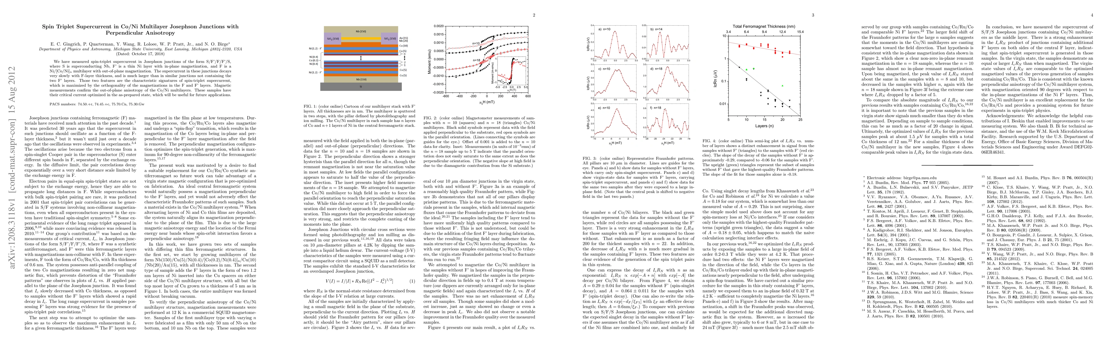 This study investigates spin-triplet supercurrent in Co/Ni multilayer Josephson junctions, finding slow decay and enhanced current due to orthogonal magnetizations in F and F' layers. The optimized critical current in the as-prepared state suggests potential for future applications.