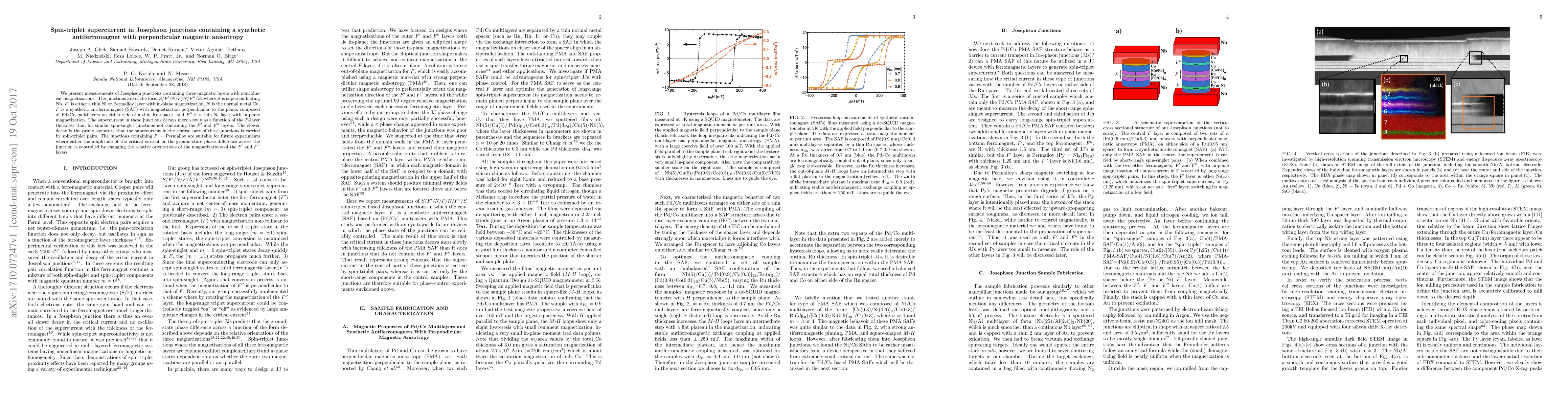 This paper reports on the measurement of spin-triplet supercurrent in Josephson junctions with a synthetic antiferromagnet, showing slower supercurrent decay due to spin-triplet pairs. The junctions, with specific magnetic layer configurations, suggest potential for controlling critical current and phase difference by altering magnetization orientations.