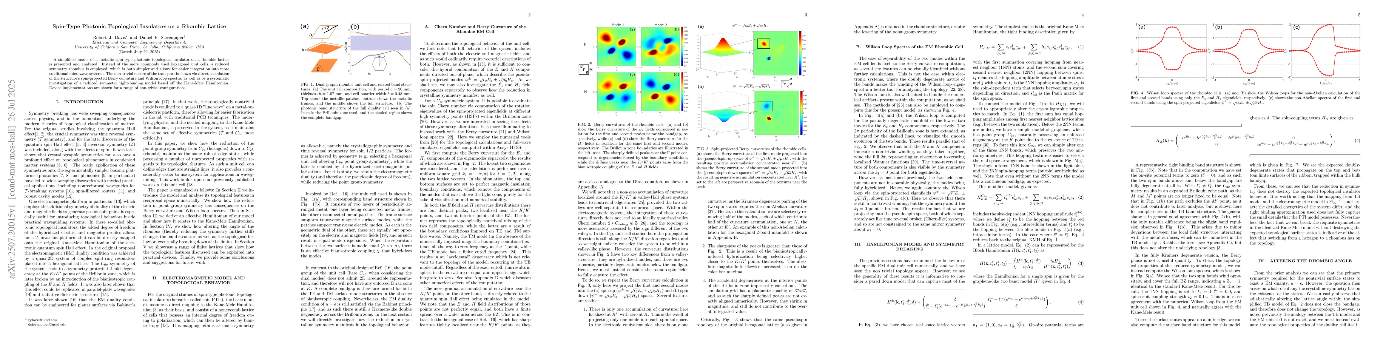 A simplified model of a metallic spin-type photonic topological insulator on a rhombic lattice is presented and analyzed. Instead of the more commonly used hexagonal unit cells, a reduced symmetry rhombus is employed, which is both simpler and allows for easier integration into more traditional microwave systems. The non-trivial nature of the transport is shown via direct calculation of the structure's spin-projected Berry curvature and Wilson loop spectra, as well as by a systematic investigation of a reduced symmetry tight-binding model based off the Kane-Mele Hamiltonian. Device implementations are shown for a range of non-trivial configurations.