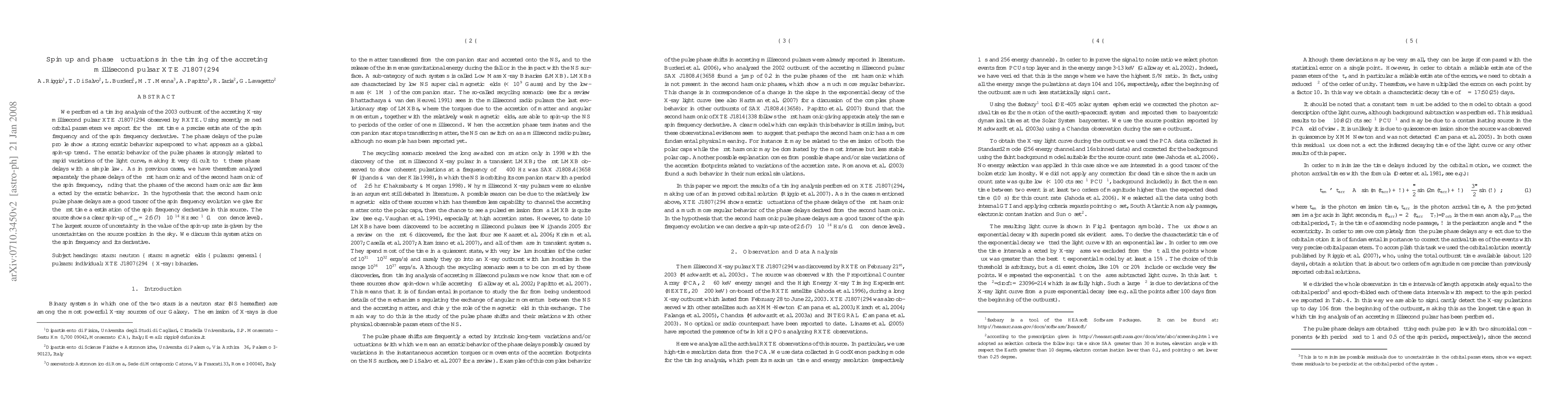 We performed a timing analysis of the 2003 outburst of the accreting X-ray millisecond pulsar XTE J1807-294 observed by RXTE. Using recently refined orbital parameters we report for the first time a precise estimate of the spin frequency and of the spin frequency derivative. The phase delays of the pulse profile show a strong erratic behavior superposed to what appears as a global spin-up trend. The erratic behavior of the pulse phases is strongly related to rapid variations of the light curve, making it very difficult to fit these phase delays with a simple law. As in previous cases, we have therefore analyzed separately the phase delays of the first harmonic and of the second harmonic of the spin frequency, finding that the phases of the second harmonic are far less affected by the erratic behavior. In the hypothesis that the second harmonic pulse phase delays are a good tracer of the spin frequency evolution we give for the first time a estimation of the spin frequency derivative in this source. The source shows a clear spin-up of $\dot \nu = 2.5(7) \times 10^{-14}$ Hz sec$^{-1}$ (1 $\sigma$ confidence level). The largest source of uncertainty in the value of the spin-up rate is given by the uncertainties on the source position in the sky. We discuss this systematics on the spin frequency and its derivative.