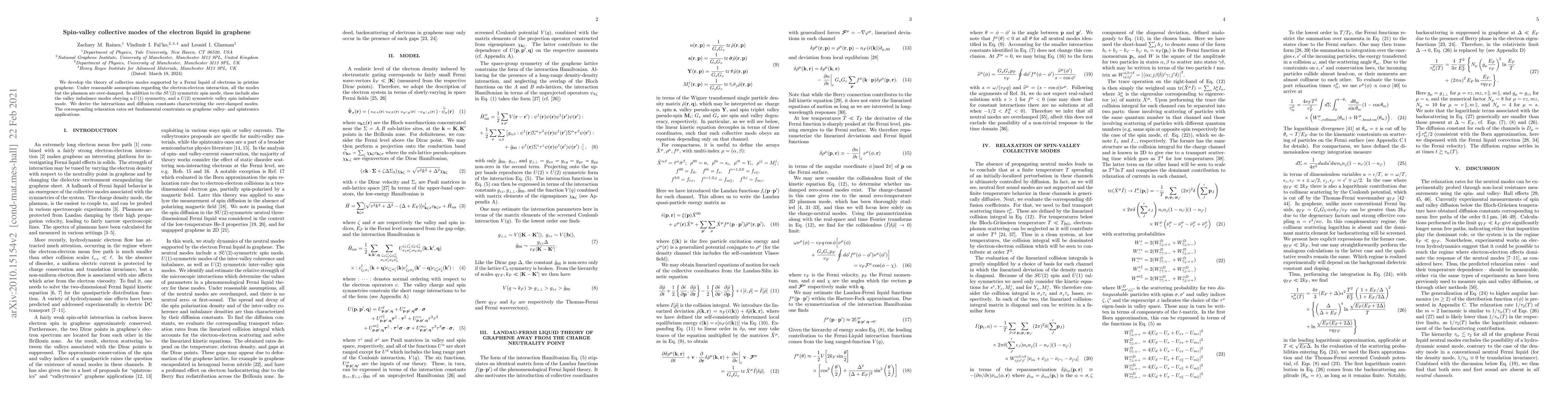 This paper develops a theoretical framework for collective modes in graphene's electron liquid, identifying over-damped modes including spin, valley imbalance, and valley spin imbalance modes. The study provides insights into the interactions and relaxation rates crucial for graphene's potential in valley- and spintronics.