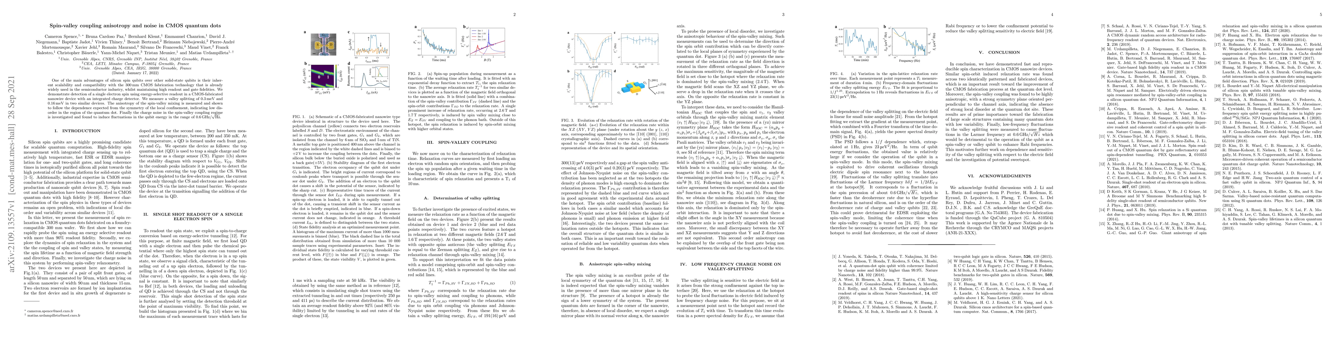 This study demonstrates the scalability of silicon spin qubits in CMOS technology, achieving single electron spin detection in nanowire devices with low disorder. It measures spin-valley coupling anisotropy and assesses charge noise-induced fluctuations affecting qubit energy at $0.6GHz/\sqrt{Hz}$.