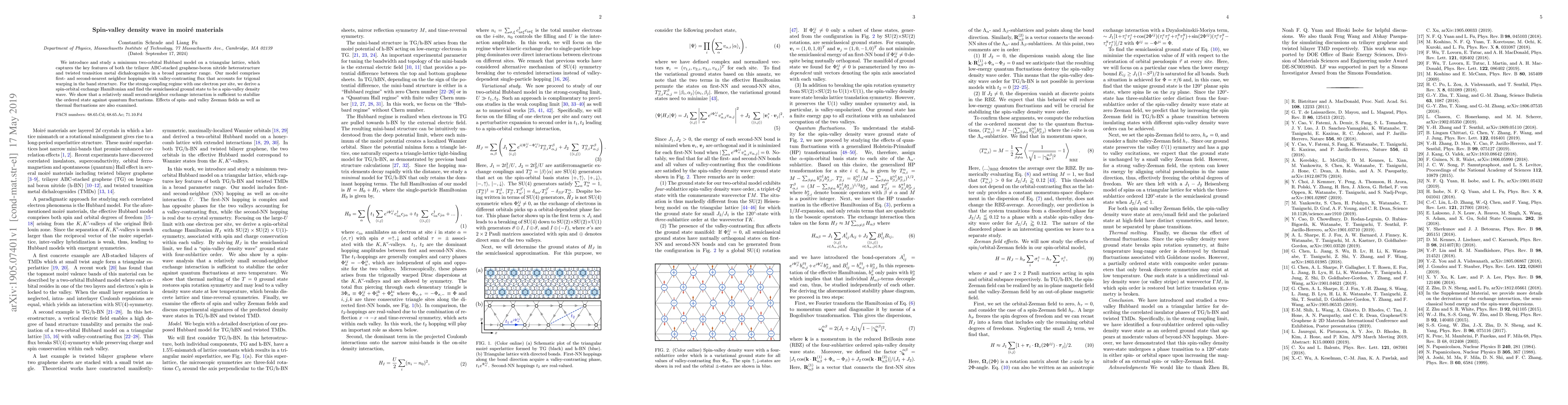 We introduce and study a minimum two-orbital Hubbard model on a triangular lattice, which captures the key features of both the trilayer ABC-stacked graphene-boron nitride heterostructure and twisted transition metal dichalcogenides in a broad parameter range. Our model comprises first- and second-nearest neighbor hoppings with valley-contrasting flux that accounts for trigonal warping in the band structure. For the strong-coupling regime with one electron per site, we derive a spin-orbital exchange Hamiltonian and find the semiclassical ground state to be a spin-valley density wave. We show that a relatively small second-neighbor exchange interaction is sufficient to stabilize the ordered state against quantum fluctuations. Effects of spin- and valley Zeeman fields as well as thermal fluctuations are also examined.