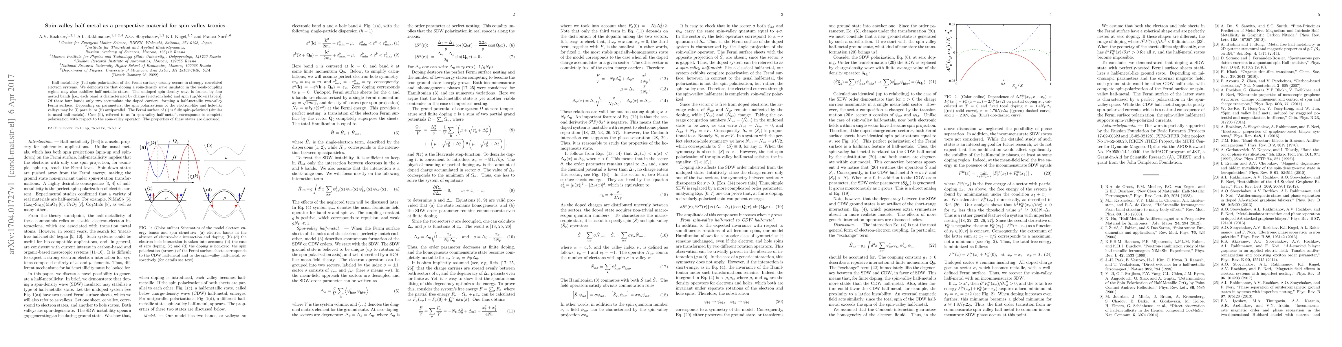 Half-metallicity (full spin polarization of the Fermi surface) usually occurs in strongly correlated electron systems. We demonstrate that doping a spin-density wave insulator in the weak-coupling regime may also stabilize half-metallic states. The undoped spin-density wave is formed by four nested bands [i.e., each band is characterized by charge (electron/hole) and spin (up/down) labels]. Of these four bands only two accumulate the doped carriers, forming a half-metallic two-valley Fermi surface. Depending on parameters, the spin polarizations of the electron-like and hole-like valleys may be (i) parallel or (ii) antiparallel. The Fermi surface of (i) is fully spin-polarized (similar to usual half-metals). Case (ii), referred to as "a spin-valley half-metal", corresponds to complete polarization with respect to the spin-valley operator. The properties of these states are discussed.