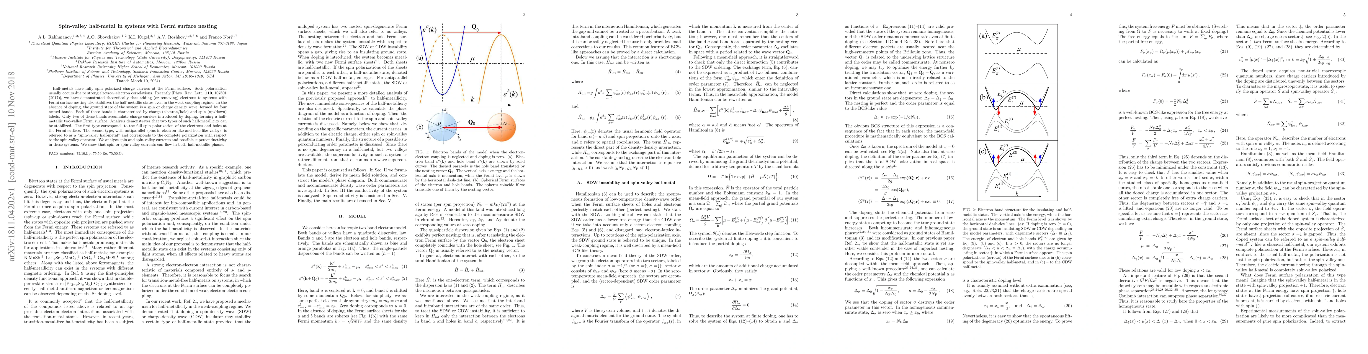 Half-metals have fully spin polarized charge carriers at the Fermi surface. Such polarization usually occurs due to strong electron--electron correlations. Recently [Phys. Rev. Lett. {\bf{119}}, 107601 (2017)], we have demonstrated theoretically that adding (or removing) electrons to systems with Fermi surface nesting also stabilizes the half-metallic states even in the weak-coupling regime. In the absence of doping, the ground state of the system is a spin or charge density wave, formed by four nested bands. Each of these bands is characterized by charge (electron/hole) and spin (up/down) labels. Only two of these bands accumulate charge carriers introduced by doping, forming a half-metallic two-valley Fermi surface. Analysis demonstrates that two types of such half-metallicity can be stabilized. The first type corresponds to the full spin polarization of the electrons and holes at the Fermi surface. The second type, with antiparallel spins in electron-like and hole-like valleys, is referred to as a "spin-valley half-metal" and corresponds to the complete polarization with respect to the spin-valley operator. We analyze spin and spin-valley currents and possible superconductivity in these systems. We show that spin or spin-valley currents can flow in both half-metallic phases.