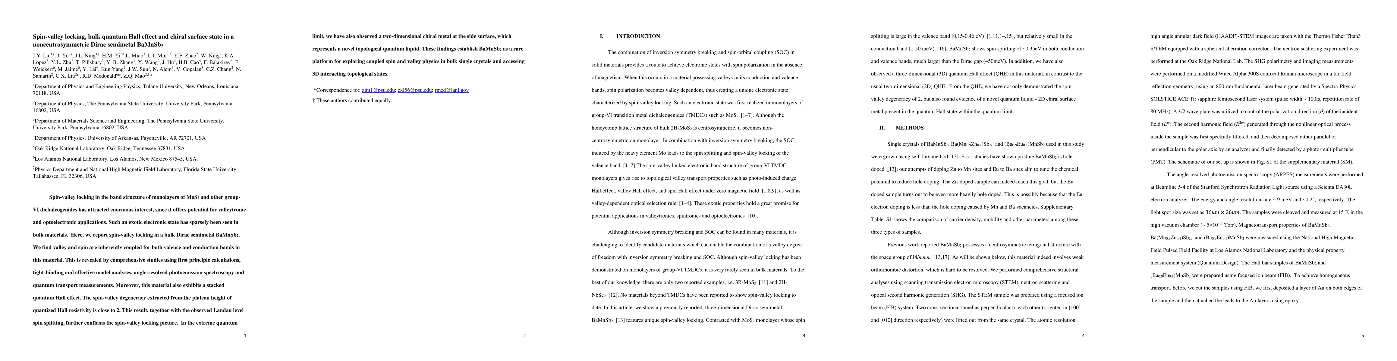 This research paper reports spin-valley locking in the bulk Dirac semimetal BaMnSb$_2$, confirmed by multiple analyses and measurements, alongside a stacked quantum Hall effect and a chiral surface state, establishing it as a unique platform for studying coupled spin and valley physics.