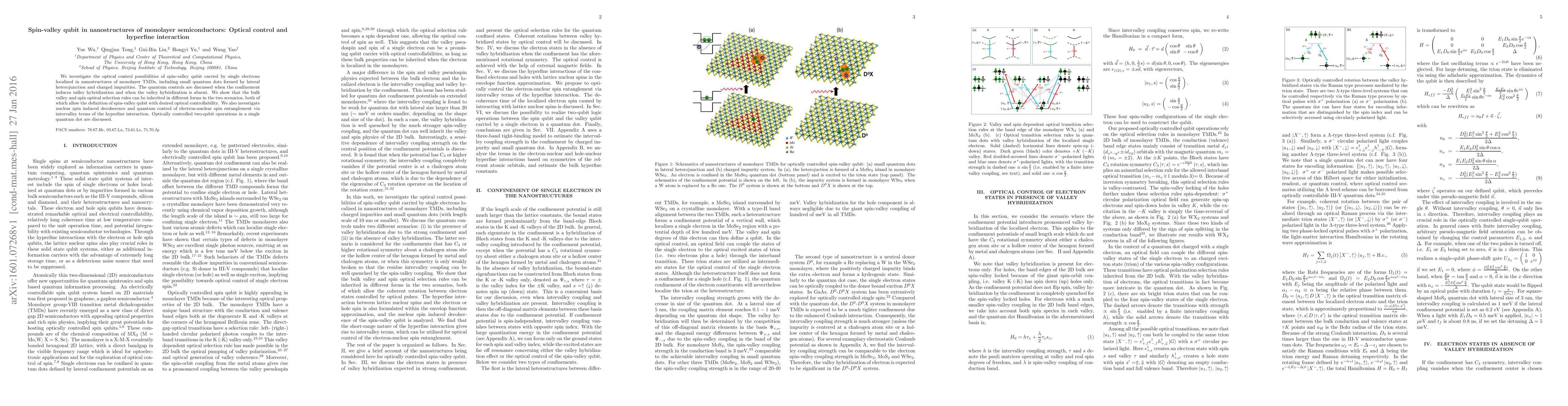 This paper explores the optical control of spin-valley qubits in monolayer TMD nanostructures, detailing scenarios with and without valley hybridization. It also examines nuclear spin decoherence and quantum control of electron-nuclear spin entanglement, proposing optically controlled two-qubit operations within a single quantum dot.