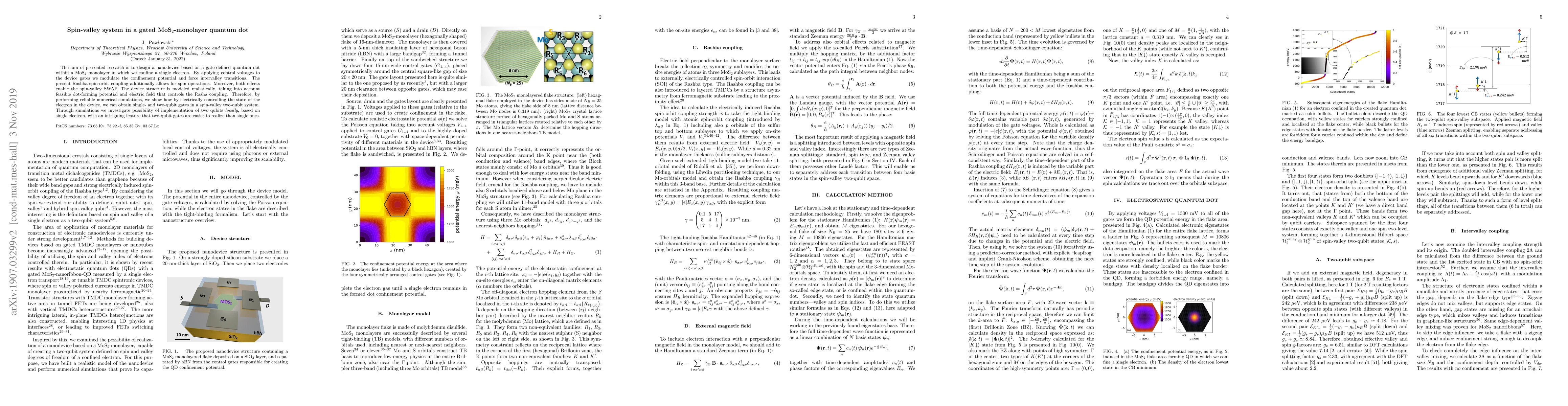 The aim of presented research is to design a nanodevice based on a gate-defined quantum dot within a MoS$_2$ monolayer in which we confine a single electron. By applying control voltages to the device gates we modulate the confinement potential and force intervalley transitions. The present Rashba spin-orbit coupling additionally allows for spin operations. Moreover, both effects enable the spin-valley SWAP. The device structure is modeled realistically, taking into account feasible dot-forming potential and electric field that controls the Rasha coupling. Therefore, by performing reliable numerical simulations, we show how by electrically controlling the state of the electron in the device, we can obtain single- and two-qubit (thus universal) gates in a spin-valley two-qubit system. Through simulations we investigate possibility of implementation of two qubits \textit{locally}, based on single electron, with an intriguing feature that two-qubit gates are easier to realize than single ones.