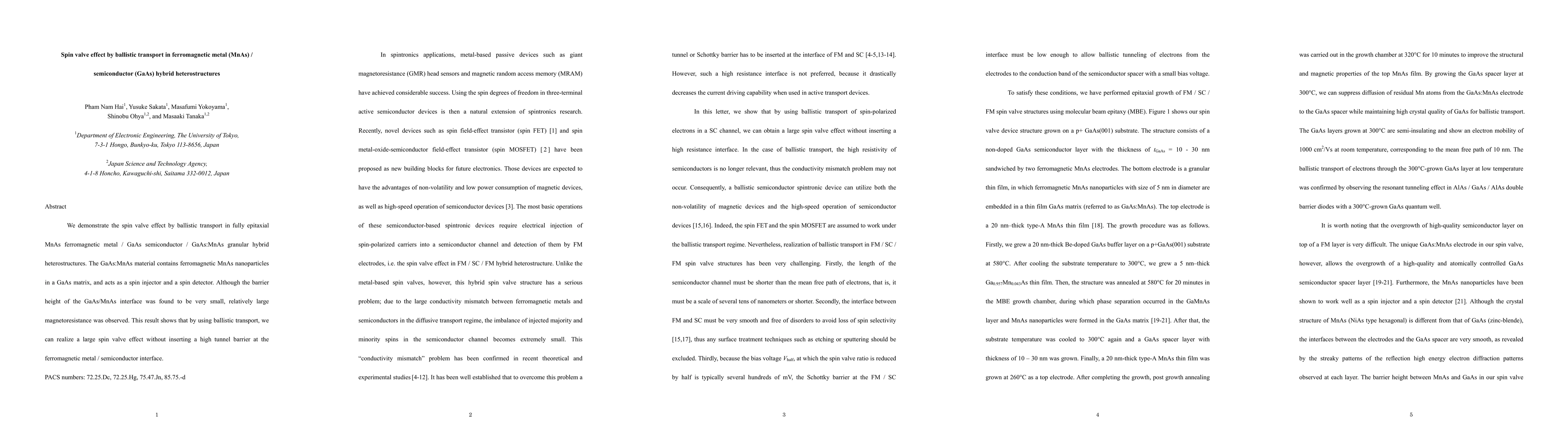 This paper demonstrates a spin valve effect through ballistic transport in MnAs/GaAs/GaAs:MnAs hybrid heterostructures, showing large magnetoresistance despite a low GaAs/MnAs interface barrier height, indicating the potential for significant spin valve effects without high tunnel barriers.
