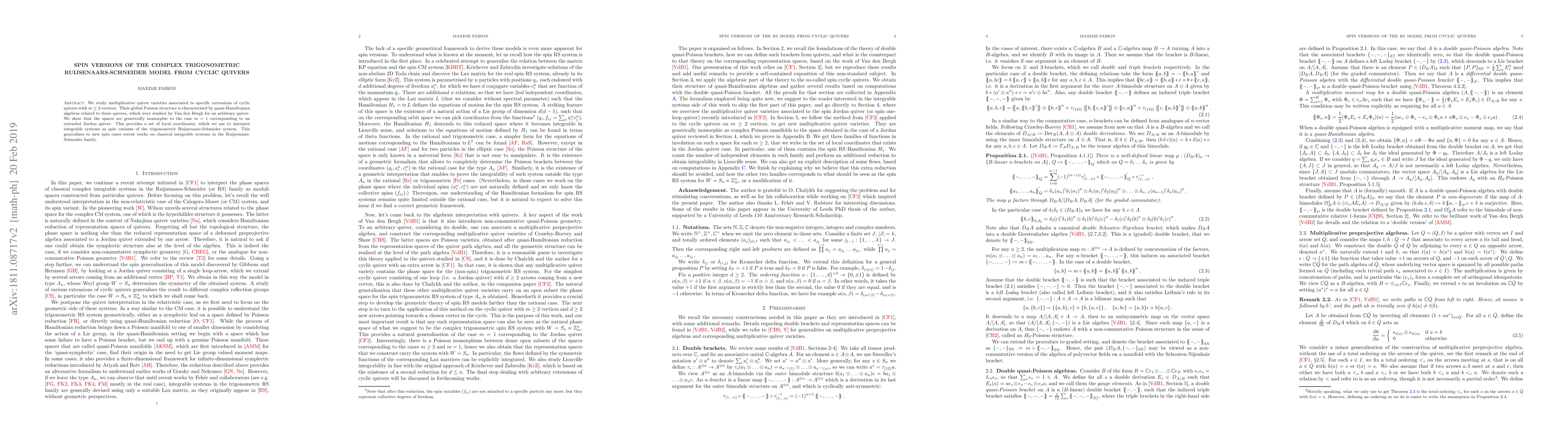 We study multiplicative quiver varieties associated to specific extensions of cyclic quivers with $m\geq 2$ vertices. Their global Poisson structure is characterised by quasi-Hamiltonian algebras related to these quivers, which were studied by Van den Bergh for an arbitrary quiver. We show that the spaces are generically isomorphic to the case $m=1$ corresponding to an extended Jordan quiver. This provides a set of local coordinates, which we use to interpret integrable systems as spin variants of the trigonometric Ruijsenaars-Schneider system. This generalises to new spin cases recent works on classical integrable systems in the Ruijsenaars-Schneider family.