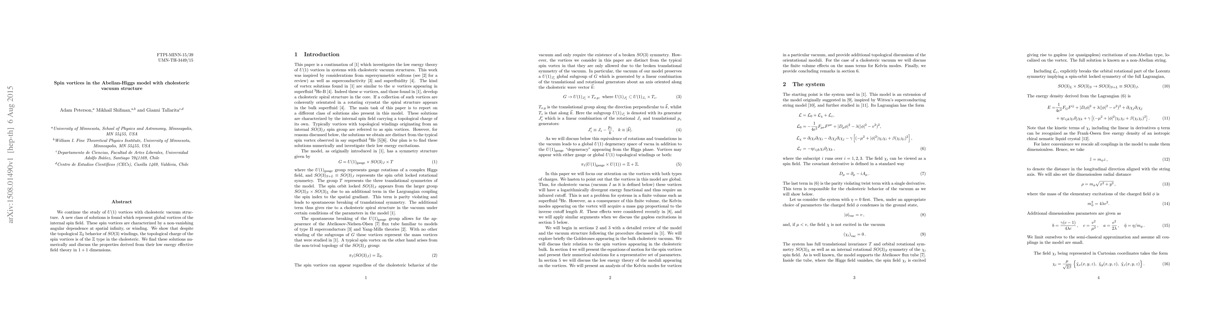 We continue the study of $U(1)$ vortices with cholesteric vacuum structure. A new class of solutions is found which represent global vortices of the internal spin field. These spin vortices are characterized by a non-vanishing angular dependence at spatial infinity, or winding. We show that despite the topological $\mathbb{Z}_2$ behavior of $SO(3)$ windings, the topological charge of the spin vortices is of the $\mathbb{Z}$ type in the cholesteric. We find these solutions numerically and discuss the properties derived from their low energy effective field theory in $1+1$ dimensions.