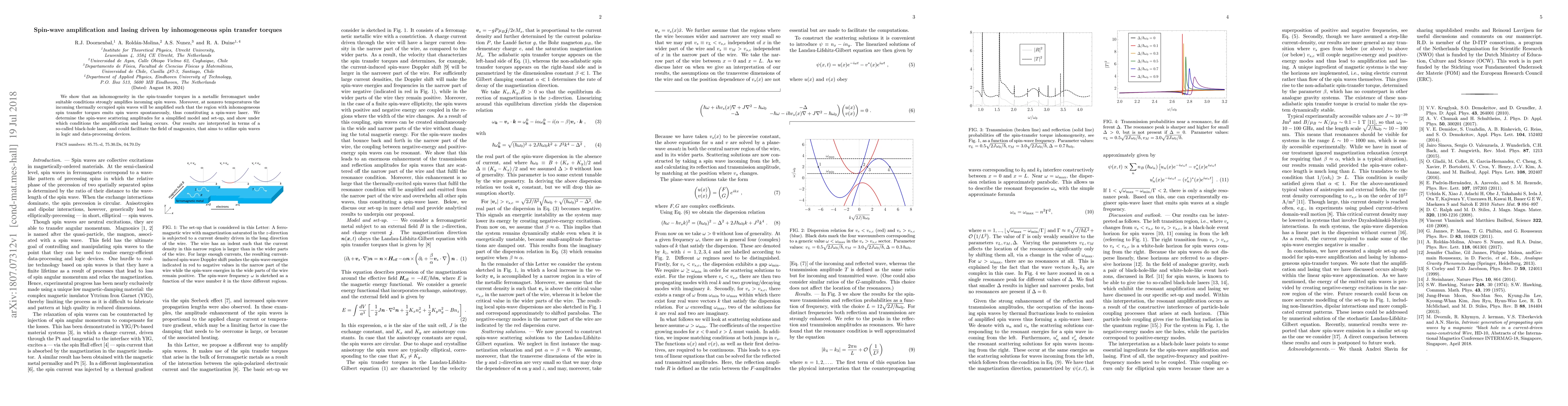 This paper demonstrates that inhomogeneities in spin-transfer torques can significantly amplify spin waves in metallic ferromagnets, leading to spontaneous spin-wave emission akin to a laser. This magnonic amplification and lasing mechanism, likened to a black-hole laser, could advance the field of magnonics for spin-wave-based logic and data-processing applications.