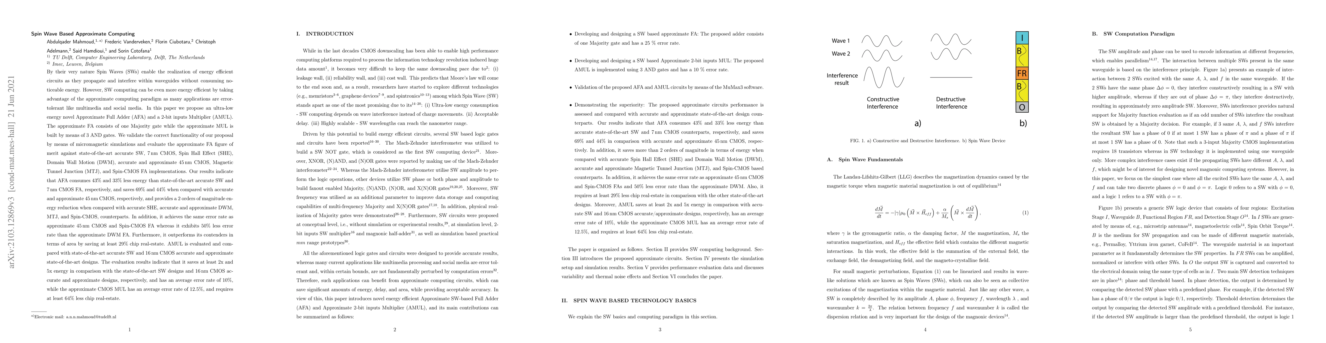 Spin Waves(SWs) enable the realization of energy efficient circuits as they propagate and interfere within waveguides without consuming noticeable energy. However, SW computing can be even more energy efficient by taking advantage of the approximate computing paradigm as many applications are error-tolerant like multimedia and social media. In this paper we propose an ultra-low energy novel Approximate Full Adder(AFA) and a 2-bit inputs Multiplier(AMUL). We validate the correct functionality of our proposal by means of micromagnetic simulations and evaluate the approximate FA figure of merit against state-of-the-art accurate SW, 7nmCMOS, Spin Hall Effect(SHE), Domain Wall Motion(DWM), accurate and approximate 45nmCMOS, Magnetic Tunnel Junction(MTJ), and Spin-CMOS FA implementations. Our results indicate that AFA consumes 43% and 33% less energy than state-of-the-art accurate SW and 7nmCMOS FA, respectively, and saves 69% and 44% when compared with accurate and approximate 45nm CMOS, respectively, and provides a 2 orders of magnitude energy reduction when compared with accurate SHE, accurate and approximate DWM, MTJ, and Spin-CMOS, counterparts. In addition, it achieves the same error rate as approximate 45nmCMOS and Spin-CMOS FA whereas it exhibits 50% less error rate than the approximate DWM FA. Furthermore, it outperforms its contenders in terms of area by saving at least 29% chip real-estate. AMUL is evaluated and compared with state-of-the-art accurate SW and 16nm CMOS accurate and approximate state-of-the-art designs. The evaluation results indicate that it saves at least 2x and 5x energy in comparison with the state-of-the-art SW designs and 16nm CMOS accurate and approximate designs, respectively, and has an average error rate of 10%, while the approximate CMOS MUL has an average error rate of 13%, and requires at least 64% less chip real-estate.
