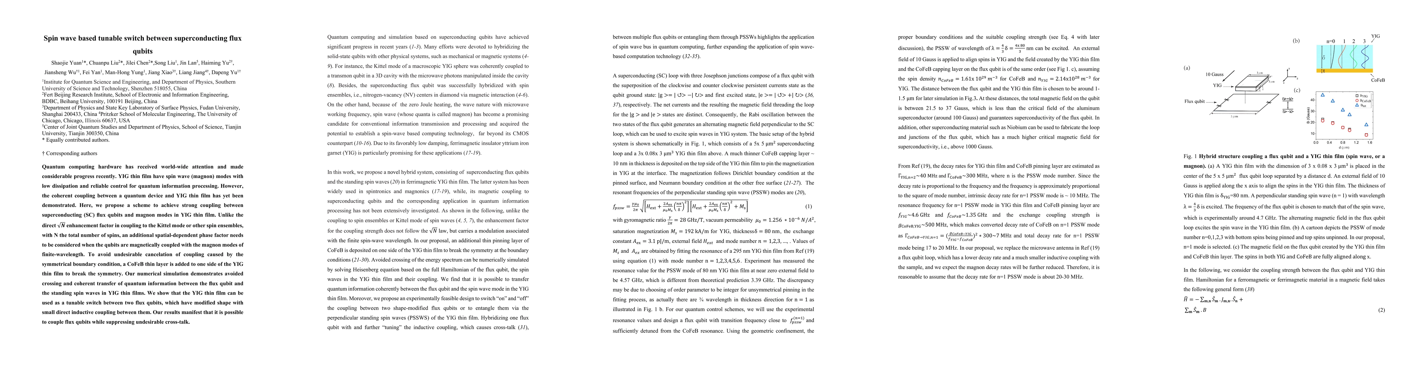 This research proposes a method to strongly couple superconducting flux qubits to spin wave modes in YIG thin films, demonstrating coherent transfer of quantum information. By adding a CoFeB thin layer to break symmetry, the scheme enables a tunable switch between two flux qubits with minimized cross-talk, using spin waves as a medium for quantum information processing.